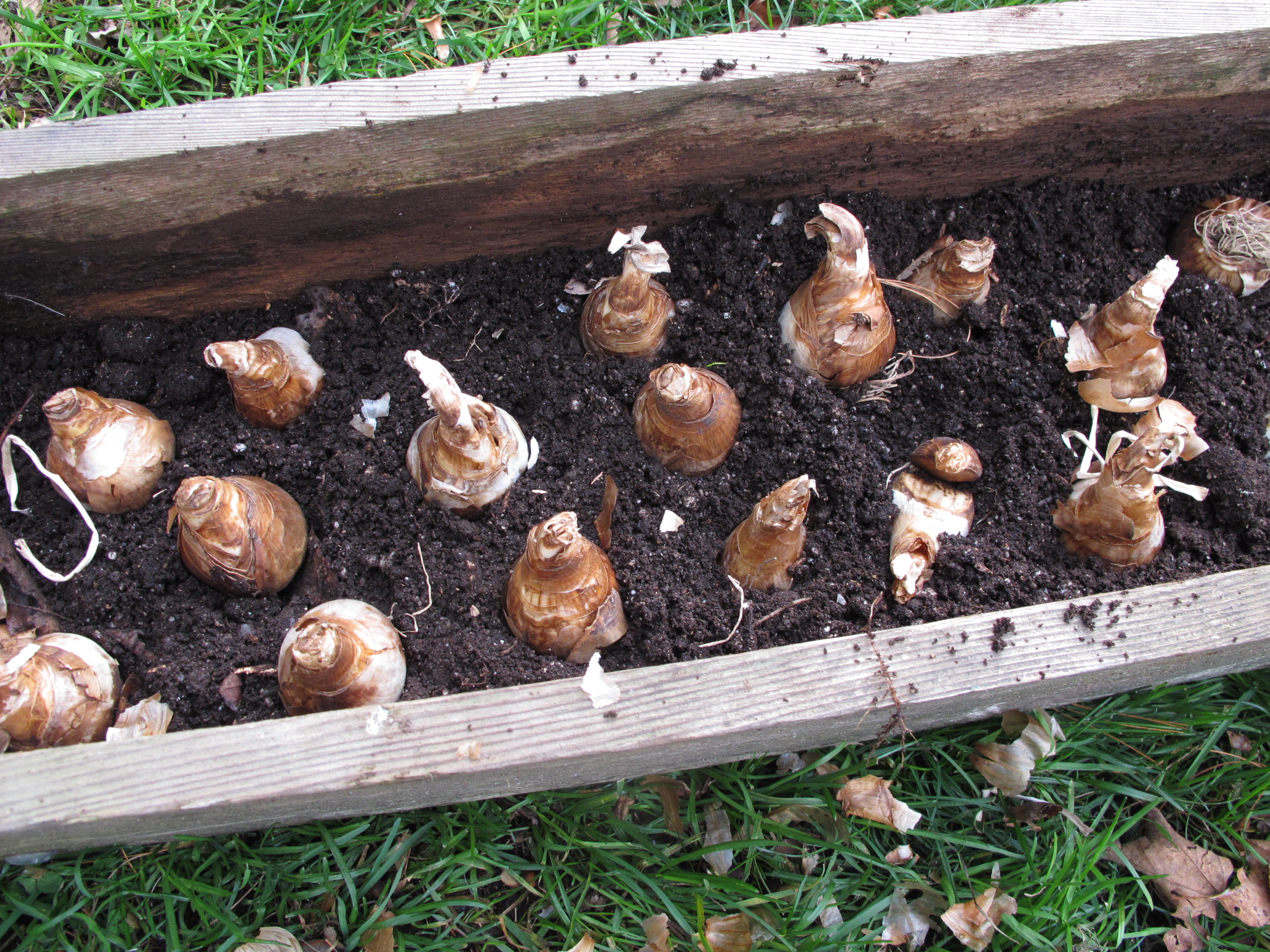 Bulbs can be planted for forcing in pots or window boxes. Good drainage is important to avoid rotting the bulbs, so don’t plant them in ordinary garden soil. I think an ideal mix is one that has half compost and half potting mix. I want the mix to be lightly moist at planting time, but not soggy. Once a month I check the pots to make sure the soil is not bone dry; if it is, I water lightly.