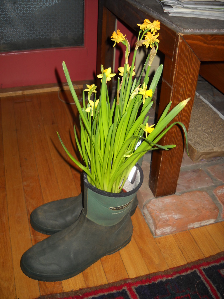 Of the early daffodils my favorite is Tete-a-Tete which produces small gold flowers, 2 or 3 blossoms per bulb. These are readily available in grocery stores in early spring and I buy them already blooming in small pots for under $5. One of my favorite things to do with them is to put a pot in a rubber boot in the mudroom, their blossoms poking out of the boot. It always evokes a reaction from visitors.