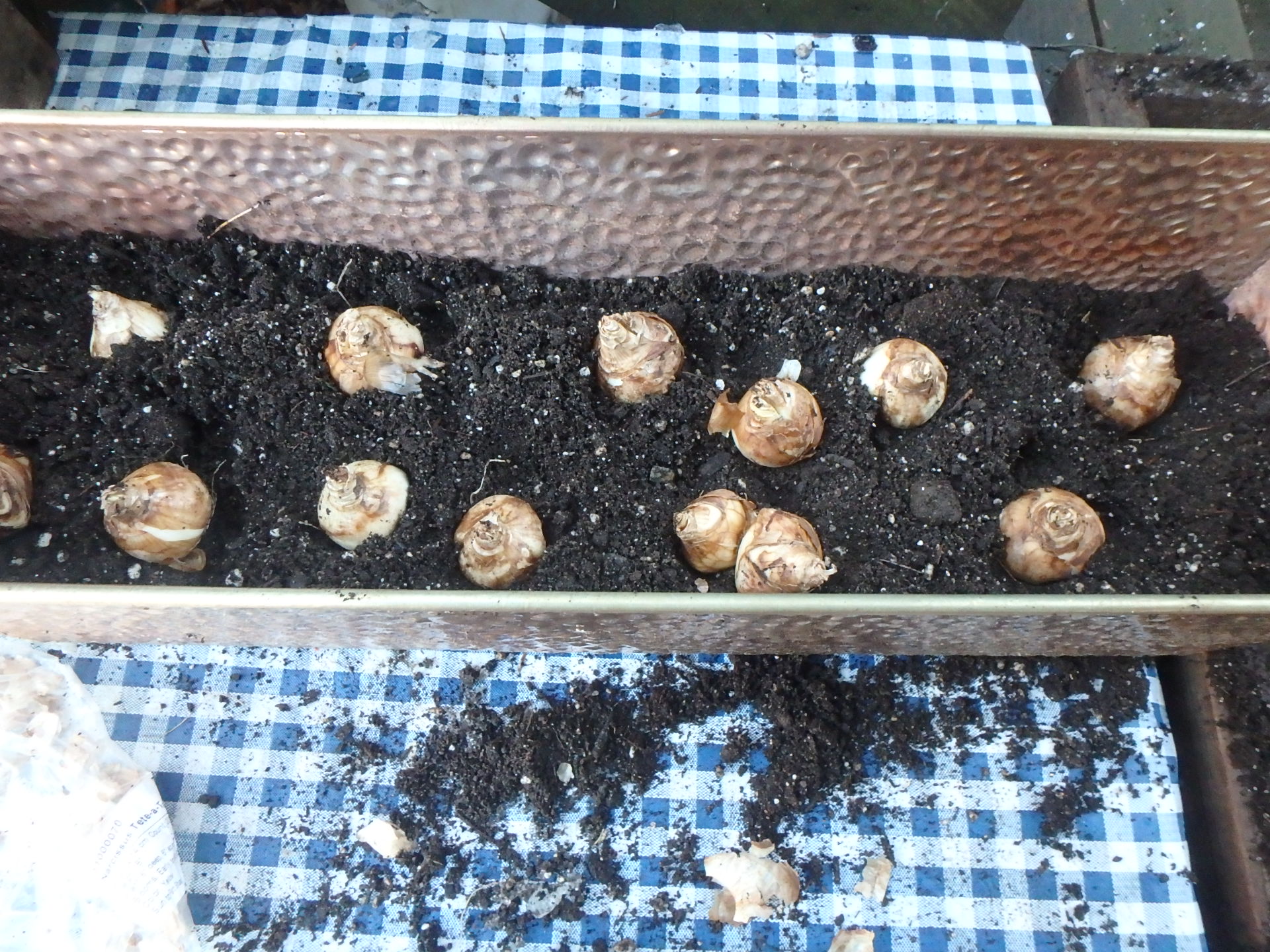 I planted 25 large daffodils in my window box, which was a bit of a squeeze, but will be dramatic when they bloom. Some years I plant 2 or 3 varieties of daffodils in it to stagger the bloom time, but this year I went for the “Big Bang” look – all blooming at once. I will bring the box out of the cold basement in early March.