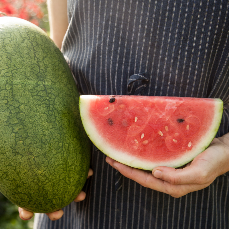 August Ambrosia is a short-season watermelon that Fruition developed over a six-year period in collaboration with Cornell University. They tested it each year with visitors to the farm to get just what people wanted: sweet, juicy melons that, even if planted in June, will produce ripe melons in August. The rinds are thin and the seeds are small. Petra told me on the phone that you can eat the seeds – or have fun spitting them!
