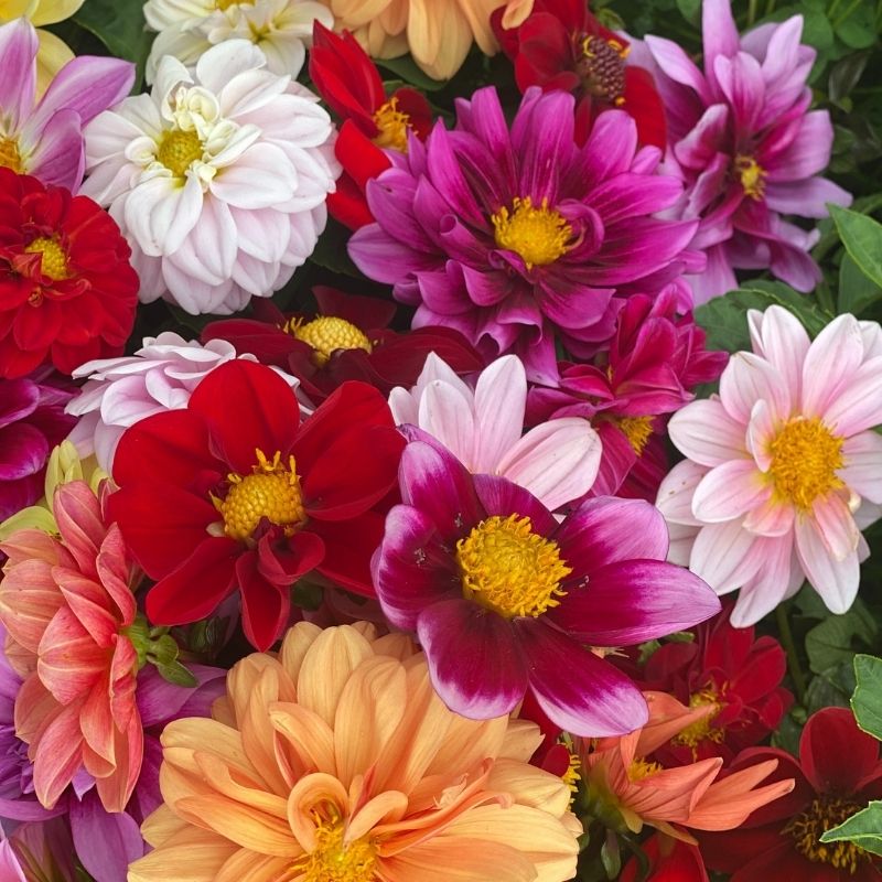 Another specialty of Fruition Seeds is their “Hope is a Verb” dahlia. Each seed is unique and each flower is different, made from innumerable crosses of dwarf and semi-dwarf collarette-style dahlias. Petra explained to me that dahlias have 8 sets of chromosomes, and consequently have many ways of expressing their genes. The plants are two-feet tall or less, with blooms one to three inches across. She said they are fabulous for short-seasons and lower light conditions. I shall start some.