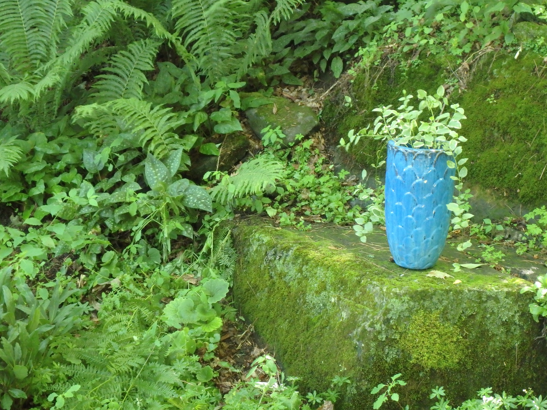 I recently weeded out a dry shady garden that has a nice piece of exposed ledge. I realized that I rarely noticed the ledge. I want visitors to pause and look at the unusual palette of plants I use in front of the ledge, too (now that the weeds are gone). What did I do? I moved a tall blue ceramic planter that I had on my shady deck down to the ledge. I have a vine with green and white leaves spilling out of the vase. It really brings the eye to that space.