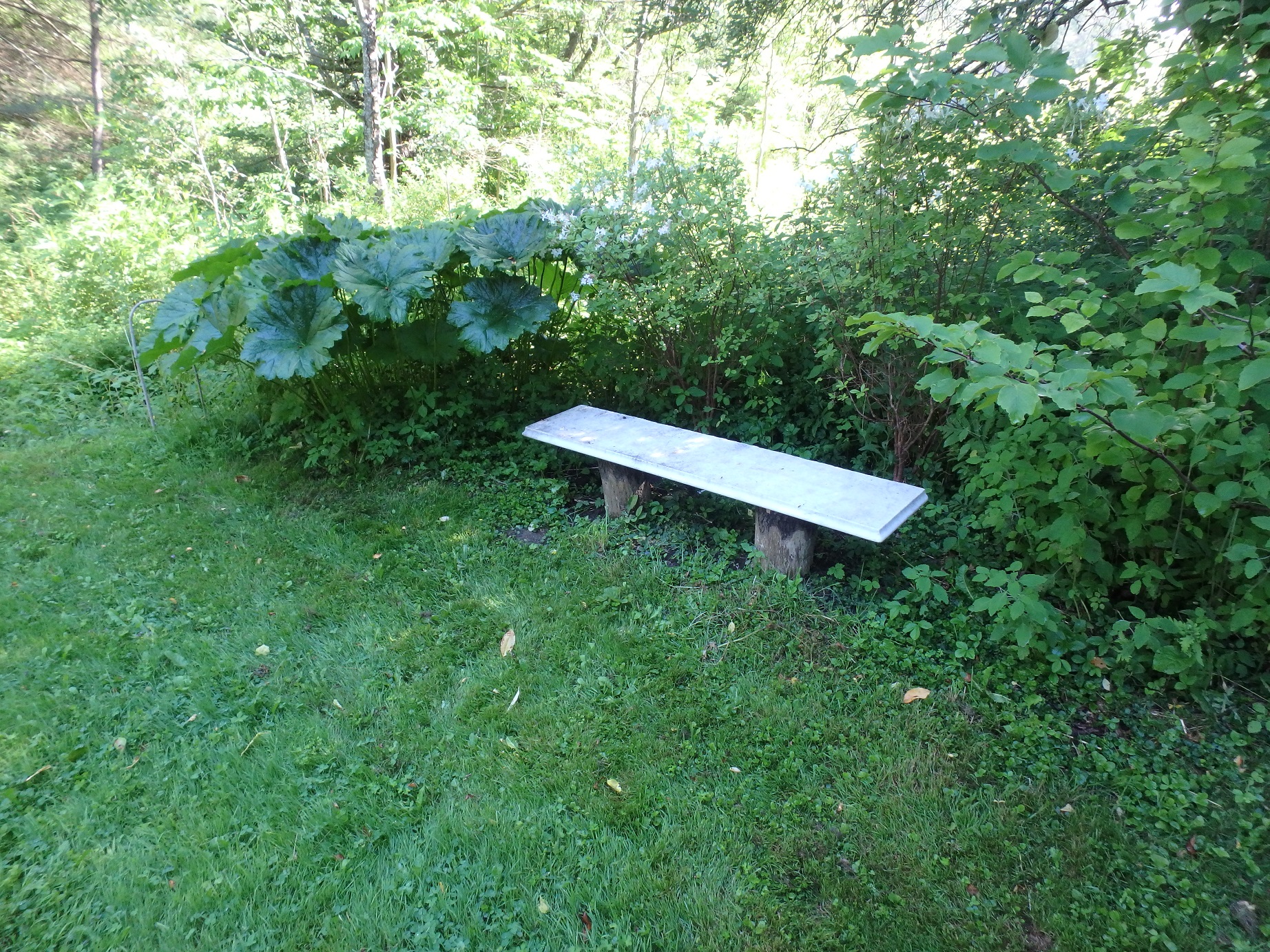 Places to sit call out to visitors. I made a bench with a piece of white marble some years ago. Even though it is not a particularly comfortable place to sit (it’s hard, stone is cold, and it has no back) – it draws me across the lawn. It is enhanced by an umbrella plant (Darmera peltata) I planted in 2009 to honor my late sister. It is a dramatic plant: it has leaves 16 to 20 inches in diameter standing up nearly 4 feet tall.