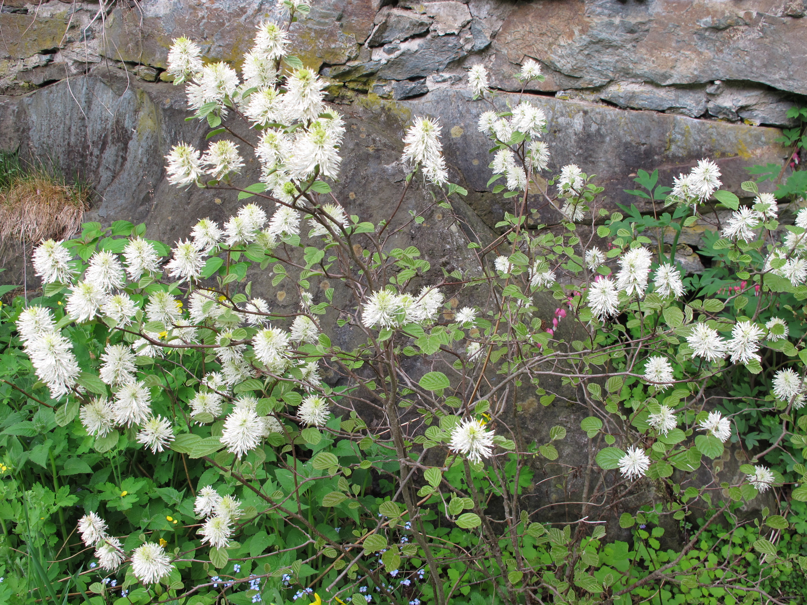 One of my favorites is called fothergilla (Fothergilla major). It has nice white bottle-brush blossoms in May and spectacular fall foliage. Mine, after 15 years and very little pruning, is only 5 or 6 feet tall and wide. It’s hardy to Zone 4.I love my weeping larch tree (Larix laricina ‘Pendula’) that grows in a flower bed. Weepers flow and bend, but do not get tall. Mine will never get more than 3 feet tall. The foliage is soft to the touch. Larches do well in wet soils, and are quite salt tolerant.