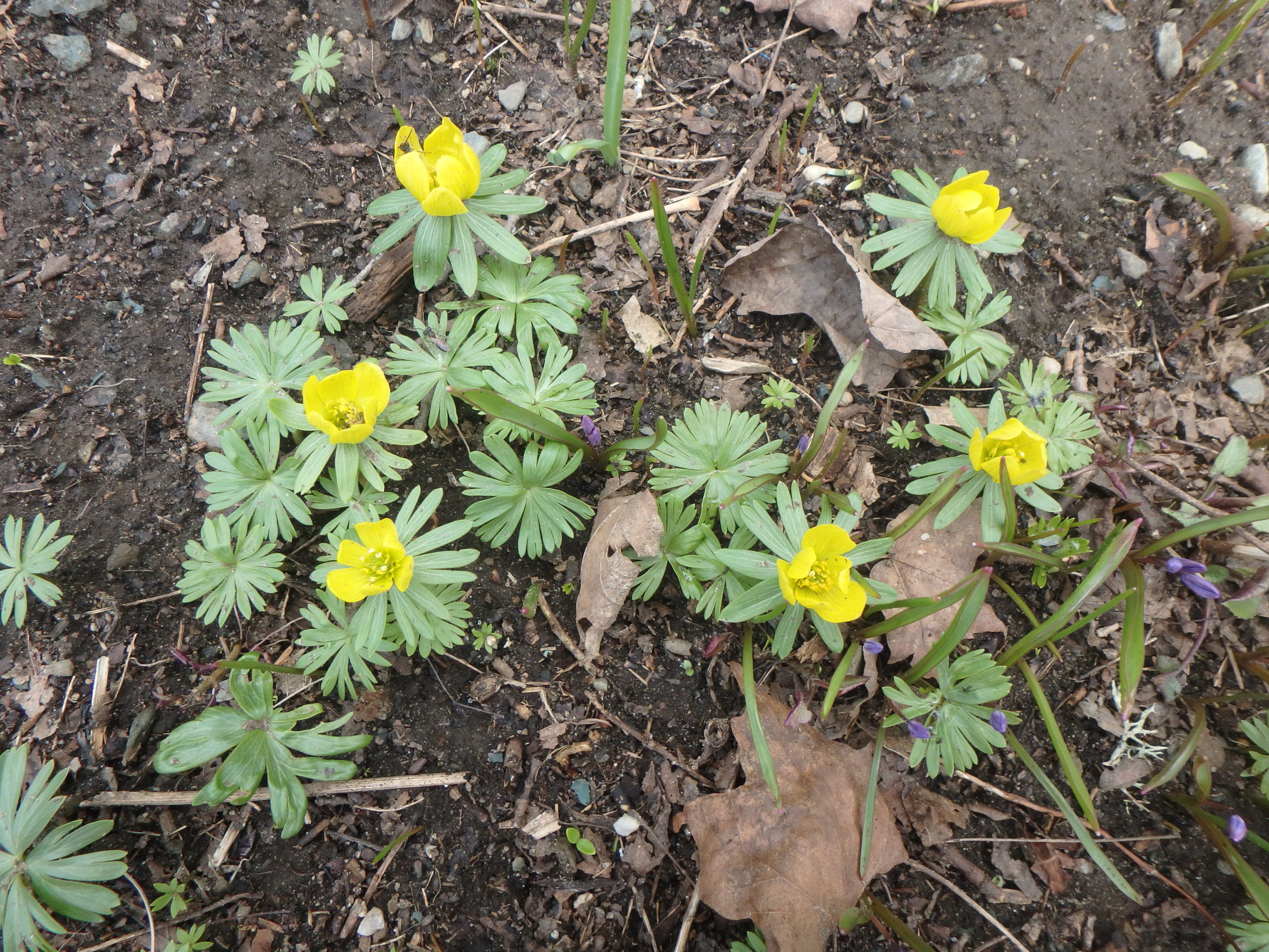 Bright yellow, school bus yellow, I associate with daffodils, and I have plenty of those that bloom in April and May. But before even the earliest are some short yellow blossoms of winter aconite (Eranthis hyemalis). I just learned that they are related to buttercups, which makes sense to me, given their color and flower shape.