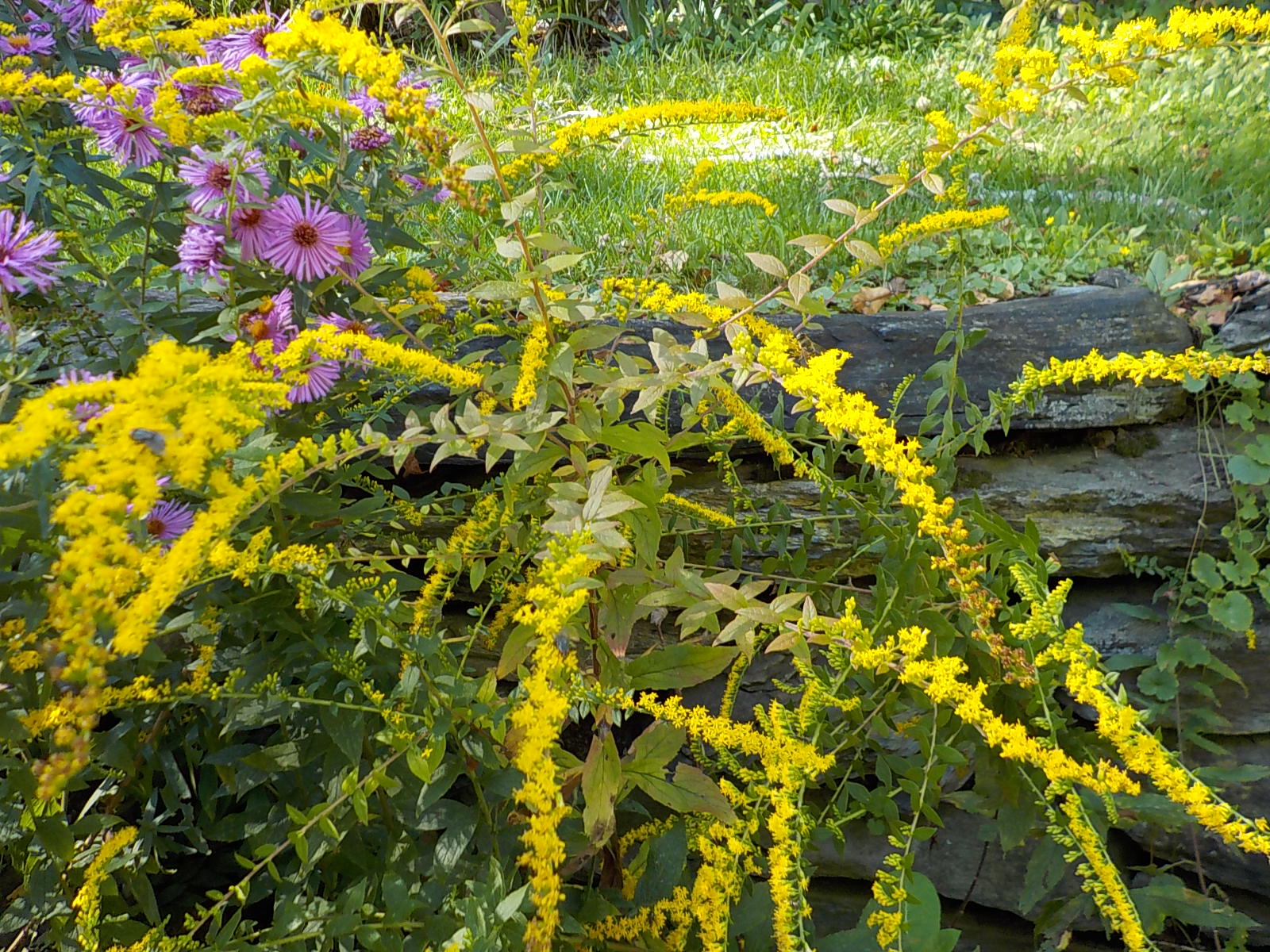 Of those species easily found for sale in garden centers, the best is Soldidago rugosa ‘Fireworks’. This plant is 3 to 5 feet tall, and stays in an ever-expanding clump in full sun or part shade, but does not take over. Its blossoms last a long time, the stems curving gently outward, like fireworks. And no, goldenrod does not cause hay fever – that is ragweed, which blooms at the same time.