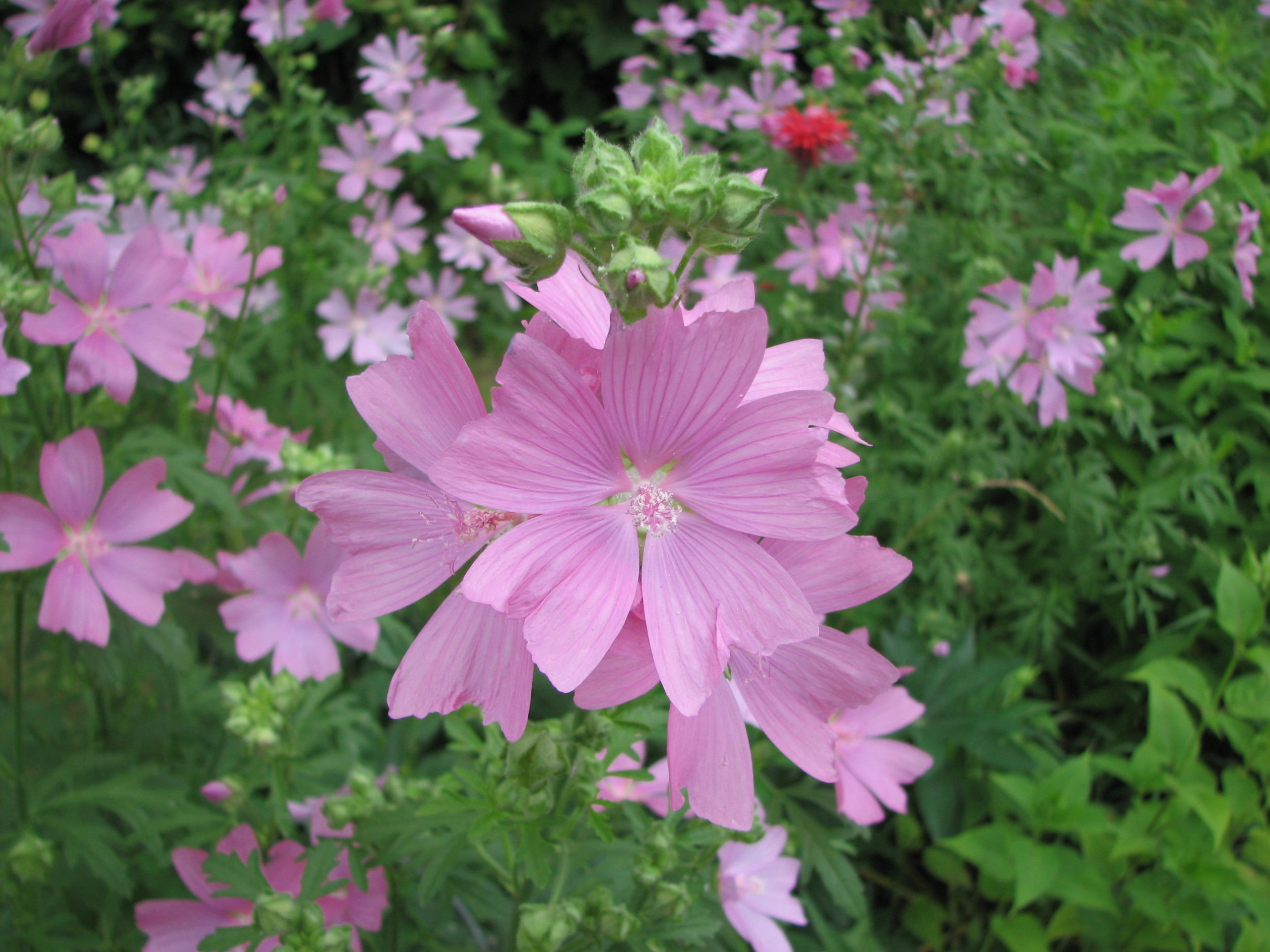 Just coming in to bloom for me right now is pink or hollyhock mallow (Malva alcea). Each plant presents lots of bright pink blossoms over several weeks that are about 1½ inches wide. She is generous, offering babies that mysteriously pop up all over my garden. There is a big clump blooming in my vegetable garden right now that I definitely did not plant.
