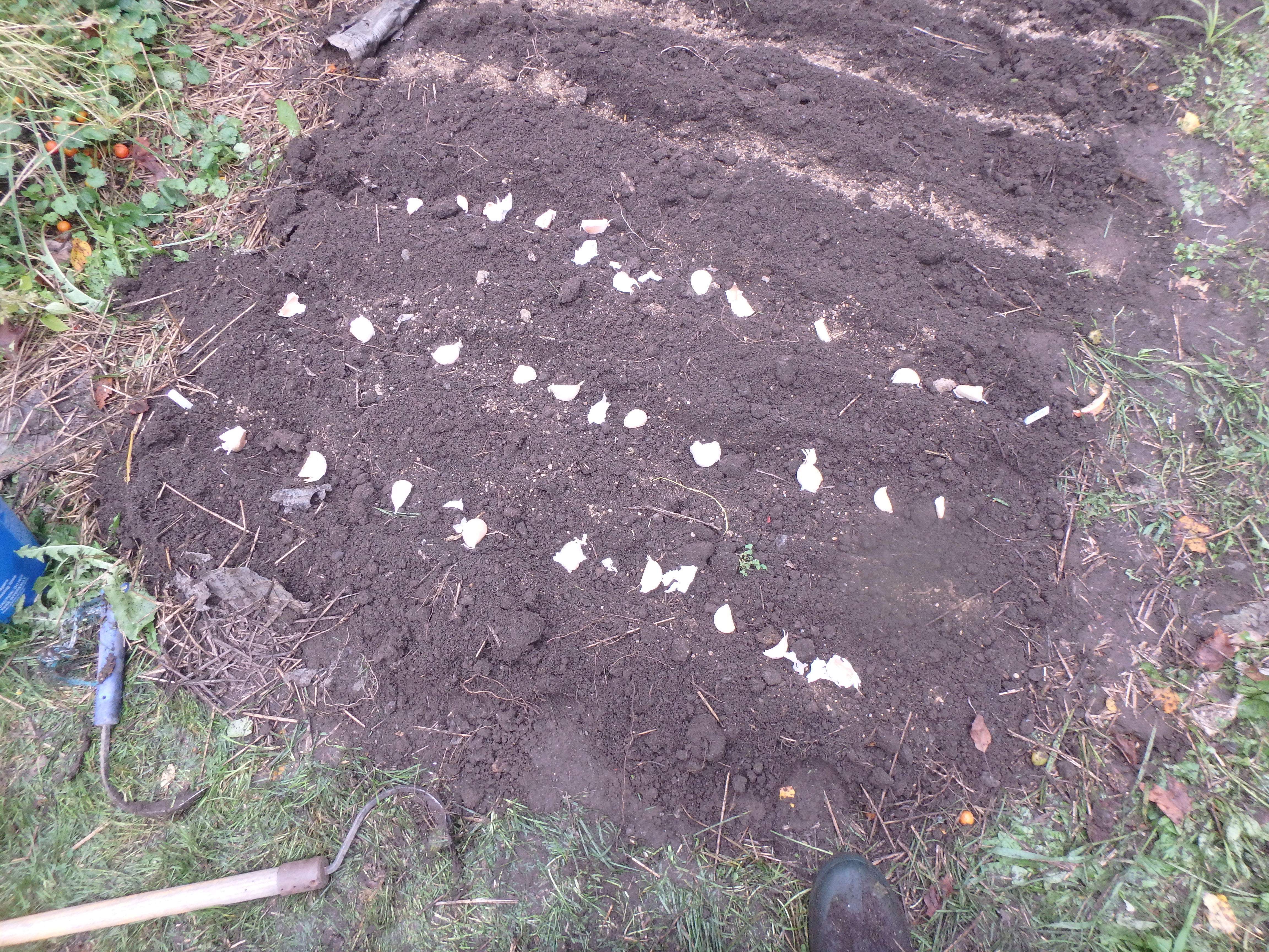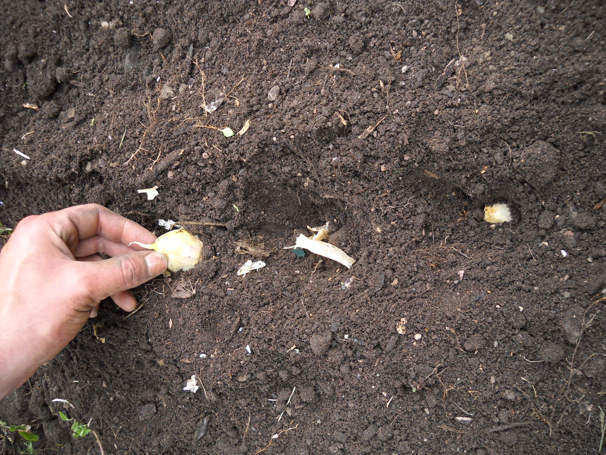 I break the garlic bulbs apart, separating the cloves – there are usually 5 to 10 cloves per head. I push the cloves into the loose soil, pointy end up, about 3 inches deep, and 4 inches apart. I cover with soil, and then pat it gently.