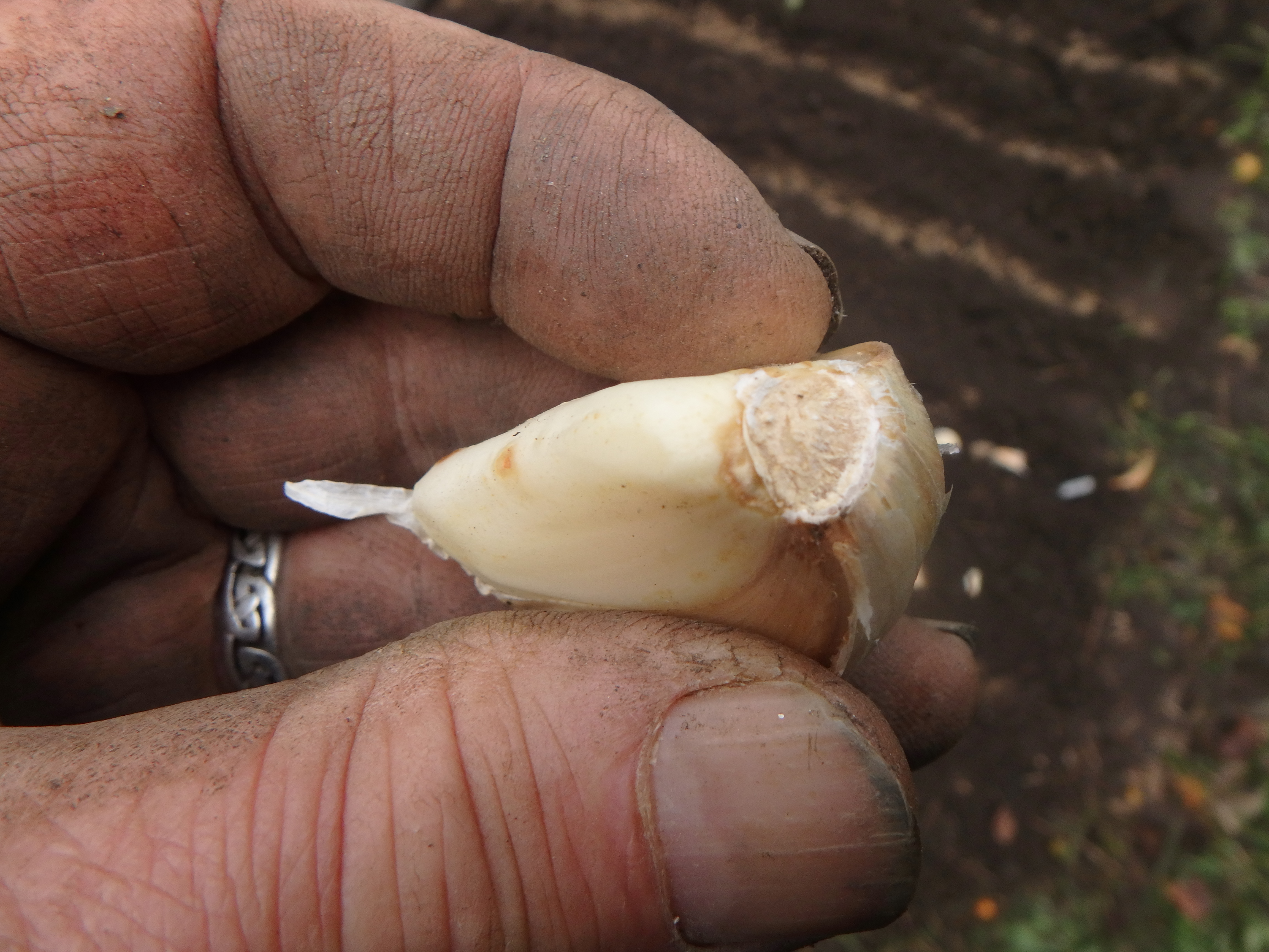It is important to plant your garlic right side up. If you look at a bulb of garlic, you should be able to see roots, or where the roots have been cut off. The top of each clove has a slightly pointy tip, and the bottom has a small, flat scar. And of course, when looking at a bulb of hard neck garlic you can see where the scape grew. If you plant the cloves upside down, they use up a lot of energy trying to get started and grow toward the sun.