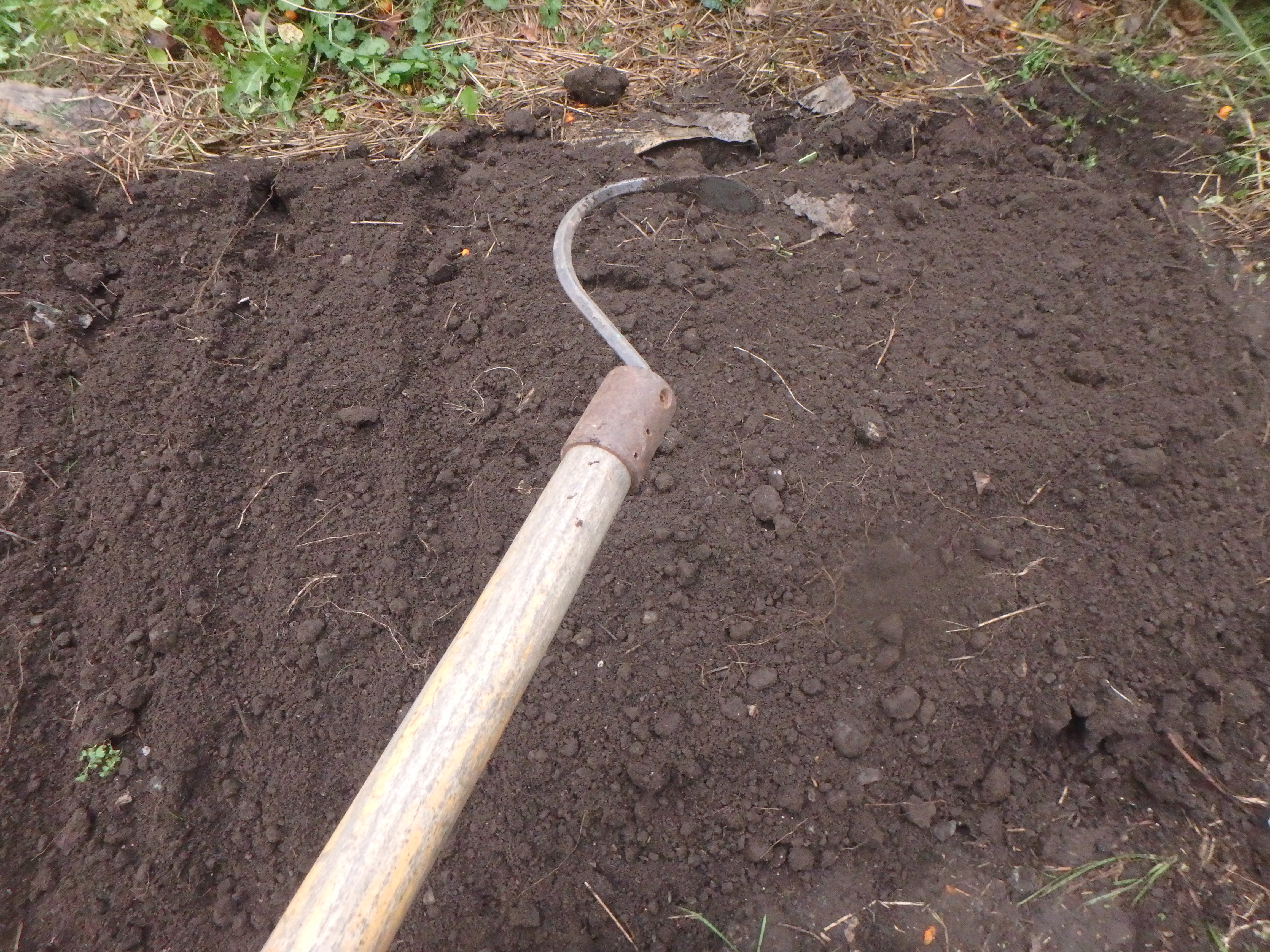 I grow garlic (and all my vegetables) in wide, mounded beds. Each bed is 30 to 36 inches wide, and mounded up 4 to 6 inches above the walkways. A short-tined garden rake or hoe is useful for shaping the beds, and to gather up loose soil from the walkways.
