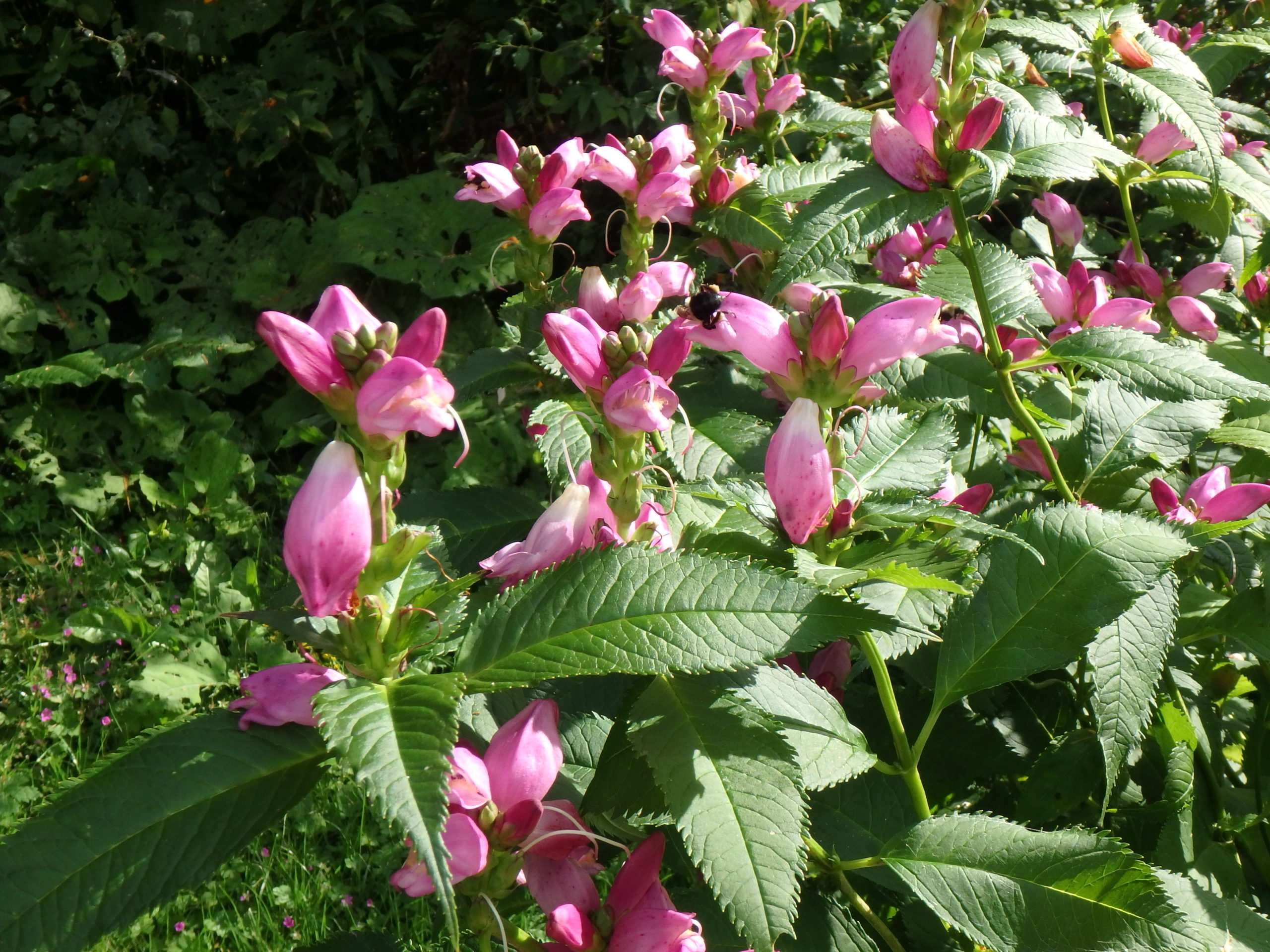 Turtlehead (Chelone lyonii) is one of my favorite fall bloomers. Each stem has numerous pink helmet-shaped blossoms an inch long that resemble, well, a turtle head. I love it in part, because it attracts bumblebees that force their way into the blossoms and disappear. I can hear them buzzing inside the blooms.