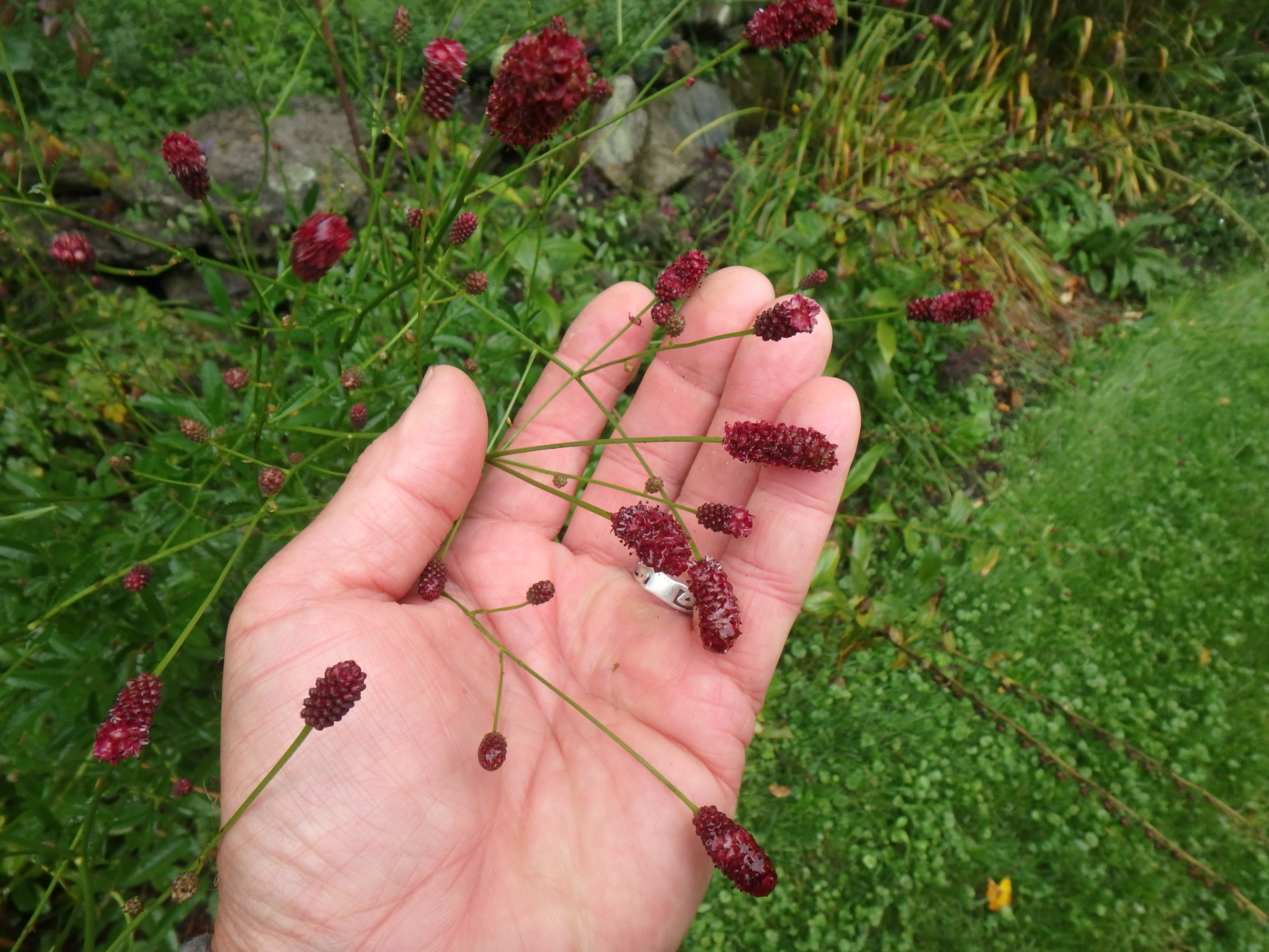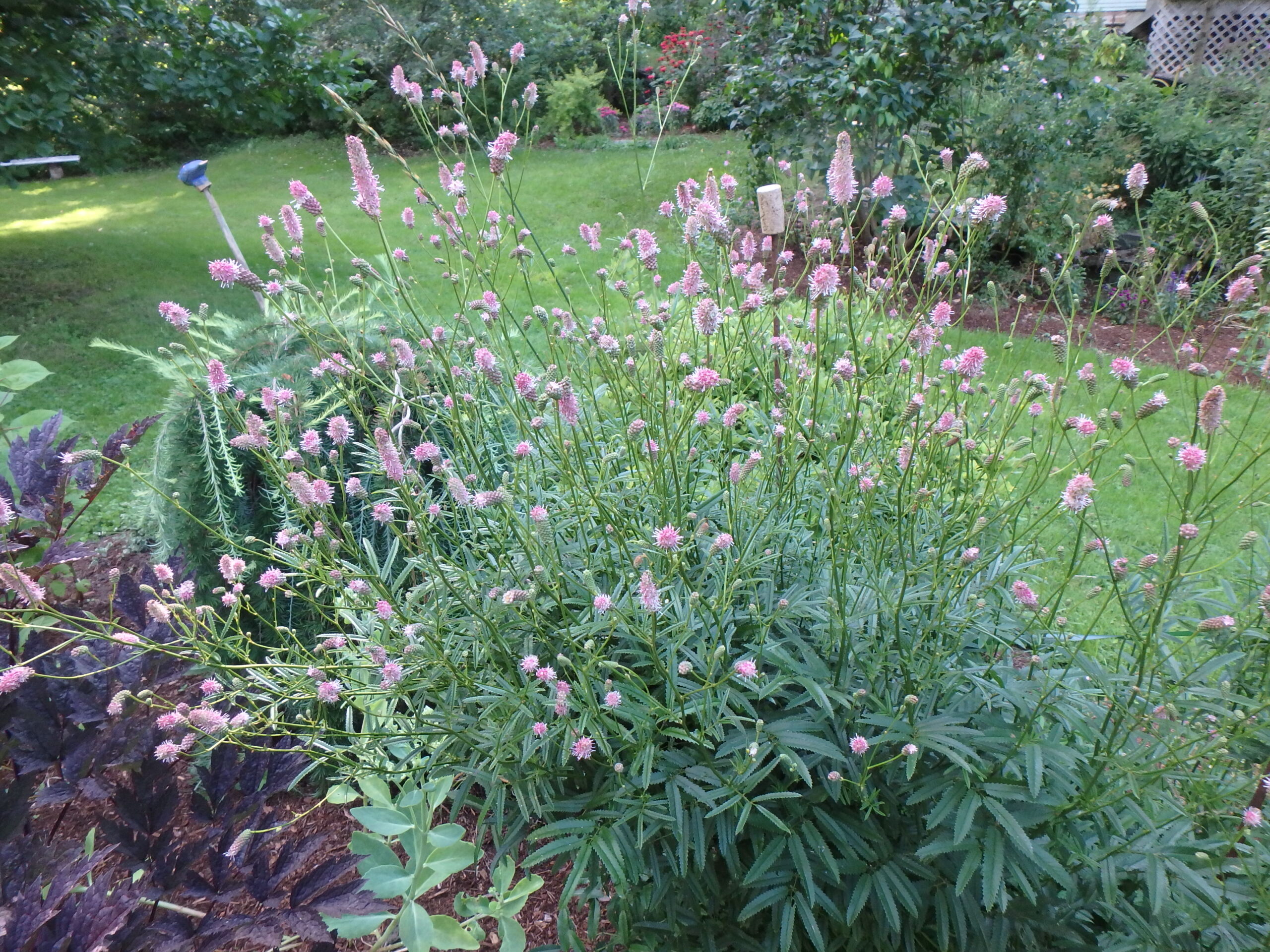 I have at least 4 other kinds of burnet, starting with a little one with variegated green and white leaves and deep maroon flowers (Sanguisorba officinalis var. microcephala ‘Little Angel’). I have others that grow 2-feet tall, and one that is 4 feet tall, both probably varieties of S. officianalis. The taller ones I tie up with stakes and strings by mid-July to keep them from flopping. A single plant will grow to be a big clump, taking a space four feet wide.