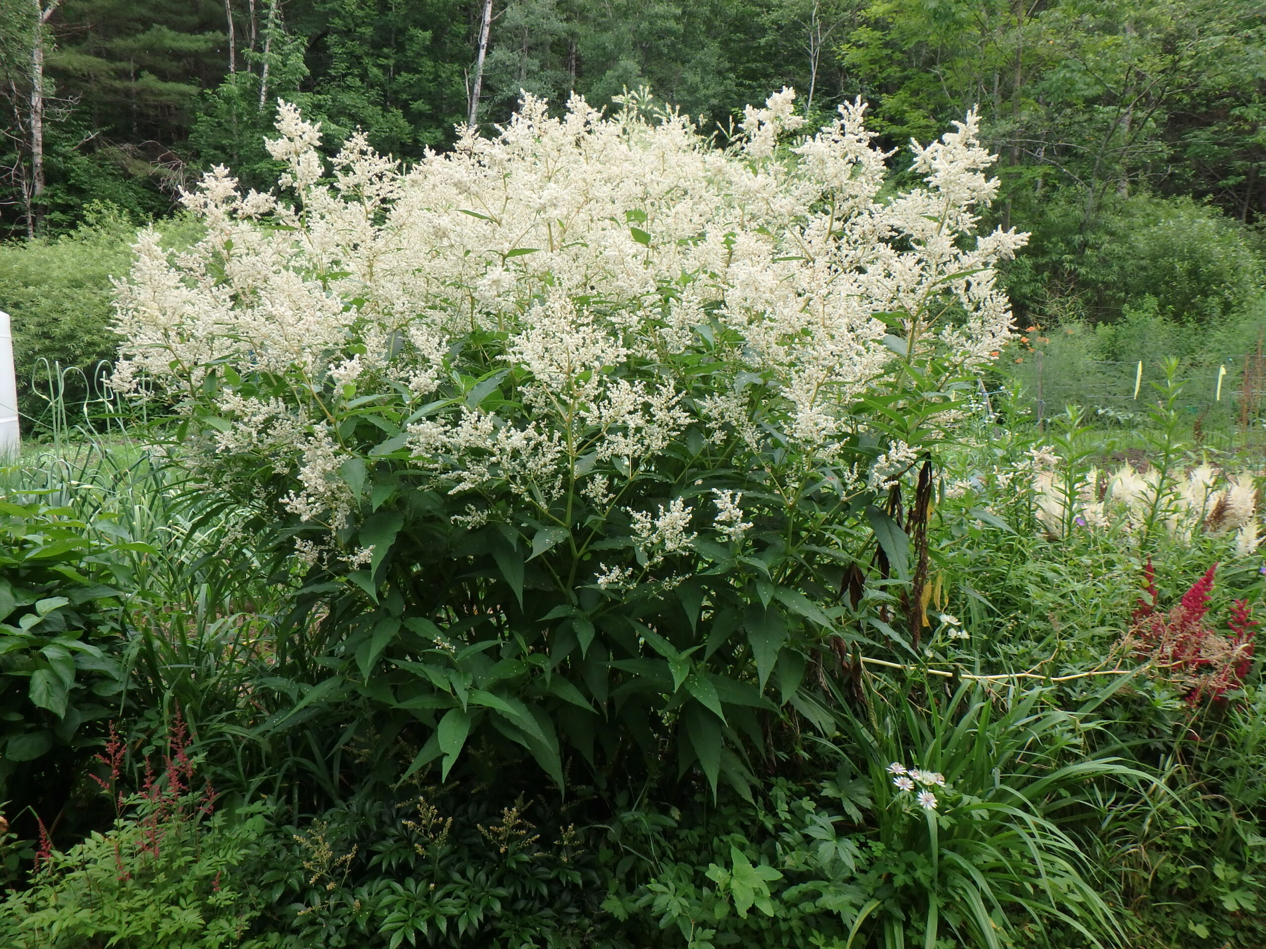 Another interesting genus is Persicaria, the fleece flowers. I have two species, P. polymorha or giant fleece flower and red bistort or mountain fleece (S. amplexicaulis). Giant fleeceflower makes a clump 6 to 8-feet tall and wide, with white blossoms a bit like astillbe blossoms – on steroids. The stems are an inch wide or more, but hollow like Japanese knotweed. The nice thing about it is that the flowers look good even after they have gone by, so 2 months of beauty is a given. Moving one is hard work, so plant it where you have plenty of space for it.