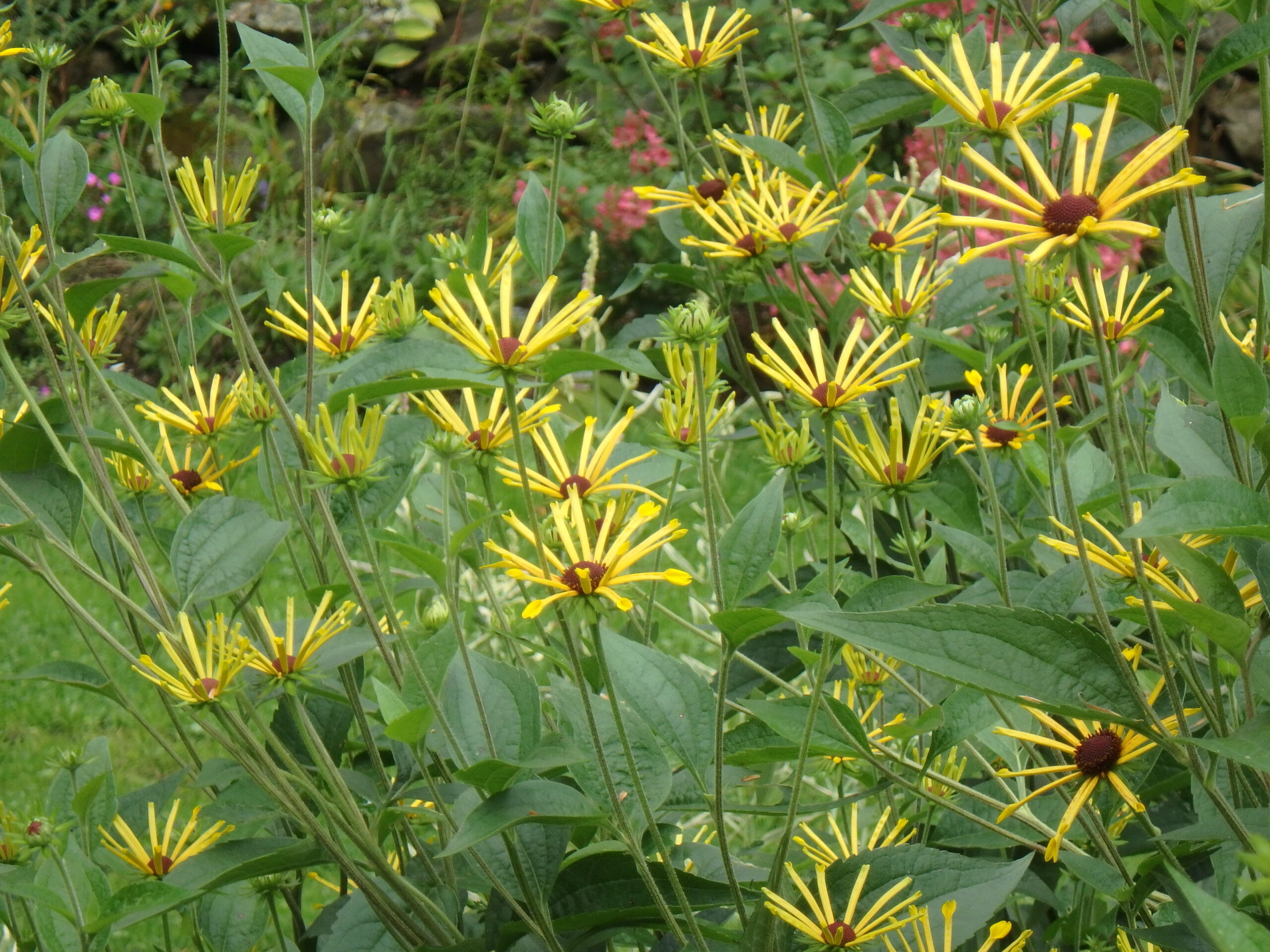 ‘Henry Eiler’ Rudbeckia. One of the latest flowers I grow. Petals are distinctive: they have space between each one, like missing teeth. Tall, often 6-feet or more. Needs to be staked early, or perhaps cut back in early June to reduce height. Blooms past frost. Full sun, rich moist soil.