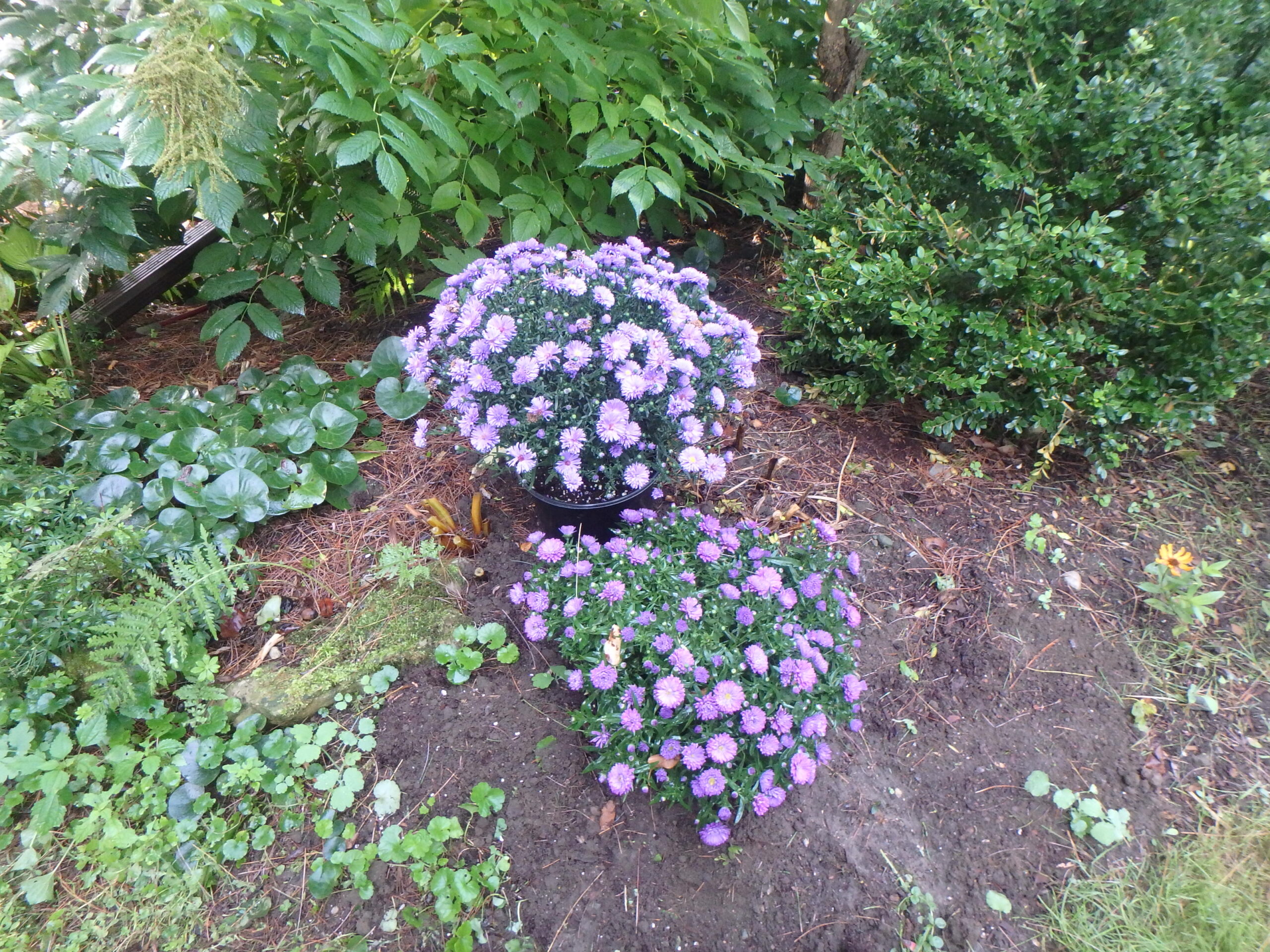 So what can you do with those empty spaces where you cut back flowers that have declined to the point that they needed to be cut back? Depending on the spacing, you might be able to fit in some chrysanthemums or fall asters. These are sold in bud or bloom in pots in grocery stores, farm stands and garden centers. They will bloom for weeks so long as you do not let them dry out. Fall asters are in the same category as the more common mums: inexpensive and lovely for filling in empty places.