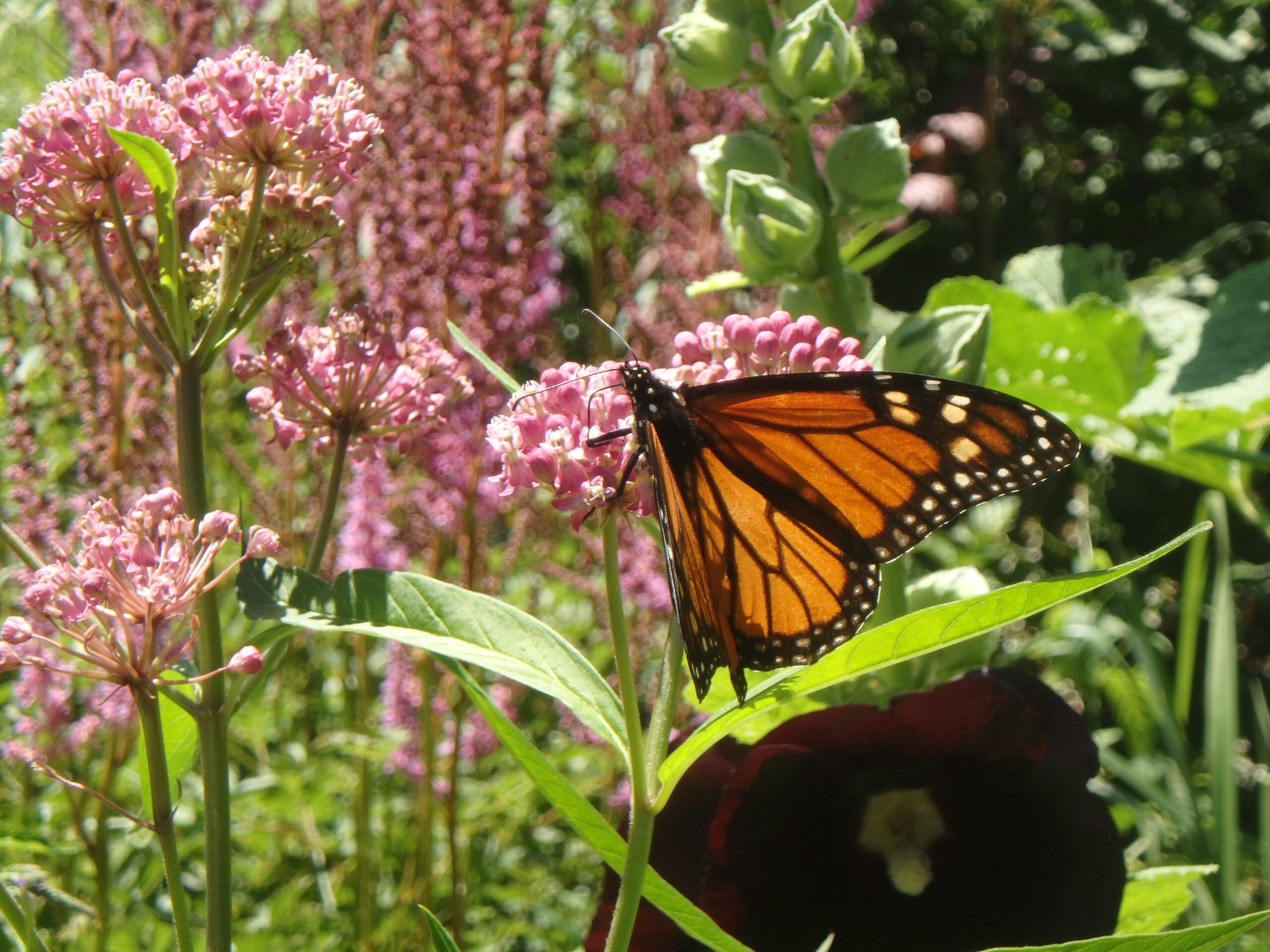Swamp milkweed (Asclepias incarnata). Related to ordinary milkweed, this likes moist soil and full sun. Unlike the wild one, this does not send runners out and spread by root. Mine get 3- to 5-feet tall, and come in pink or white. Readily available at garden centers.