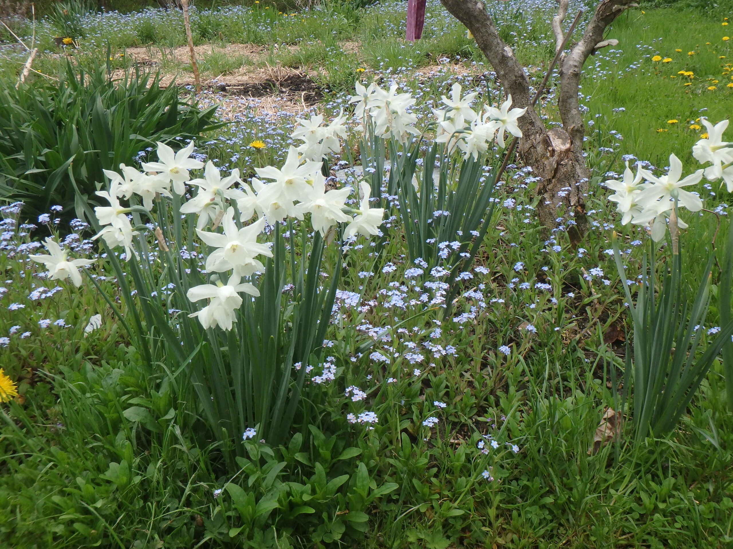 Forget-Me-Nots (Myosotis sylvatica). I have these blooming now by the hundred everywhere I look, sun or shade. These lovely low-growing blue (or sometimes pink or white) flowers self-sow bountifully. They prefer rich moist soil and will do well in sun or shade. Because they come back from seeds so easily we let them bloom, then often pull them out like weeds to plant something else.