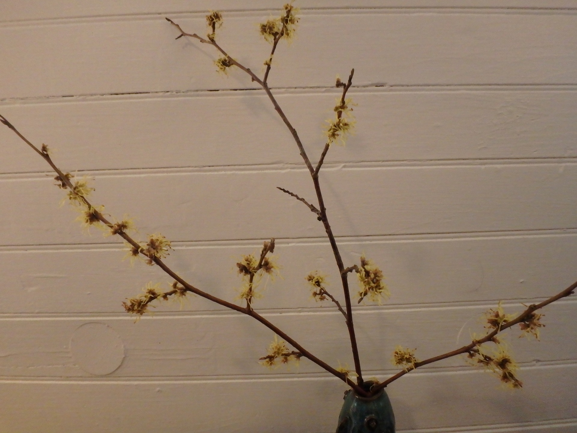 Of my outdoor flowering plants, only witchhazel (Hamamelis virginiana) is still in bloom. Its yellow flowers have strap-like curly petals that remind me ever so slightly of yellow spiders dancing on the branches. The flowers are, theoretically, fragrant, but I have never noticed such.