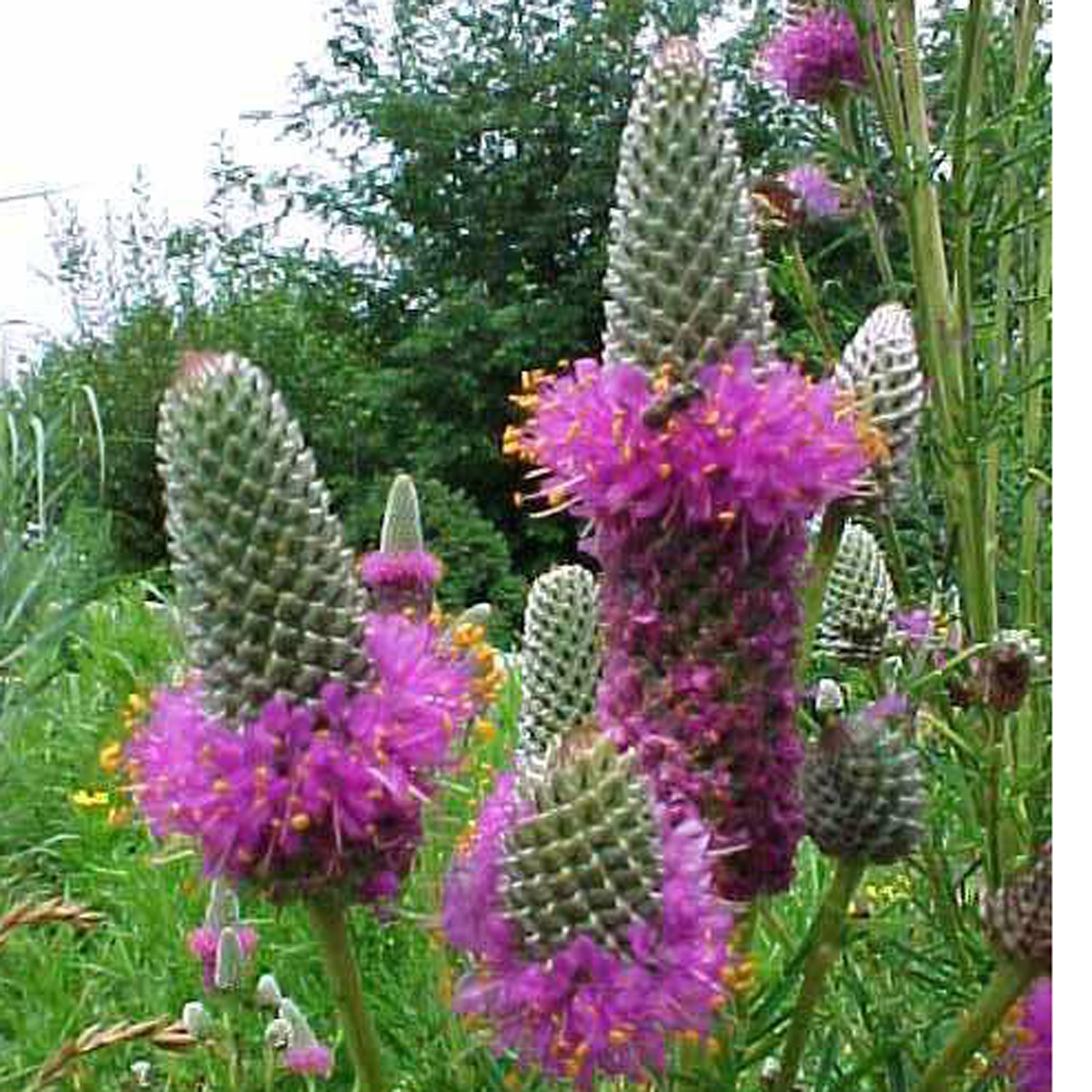 Purple Prairie Clover (Dalea purpurea). Browsing the on-line photos that are not included in Van Berkum’s printed catalog, the photo caught my eye. Nothing like the clovers I know, it stands 24 to 30 inches tall, and has showy cylindrical cones covered with tiny magenta flowers. The blossoms remind me of teasel flowers in that only part of the cone is blooming at any given time. Native to Missouri, it is hardy to Zone 3 (minus 30 degrees) and needs full sun.