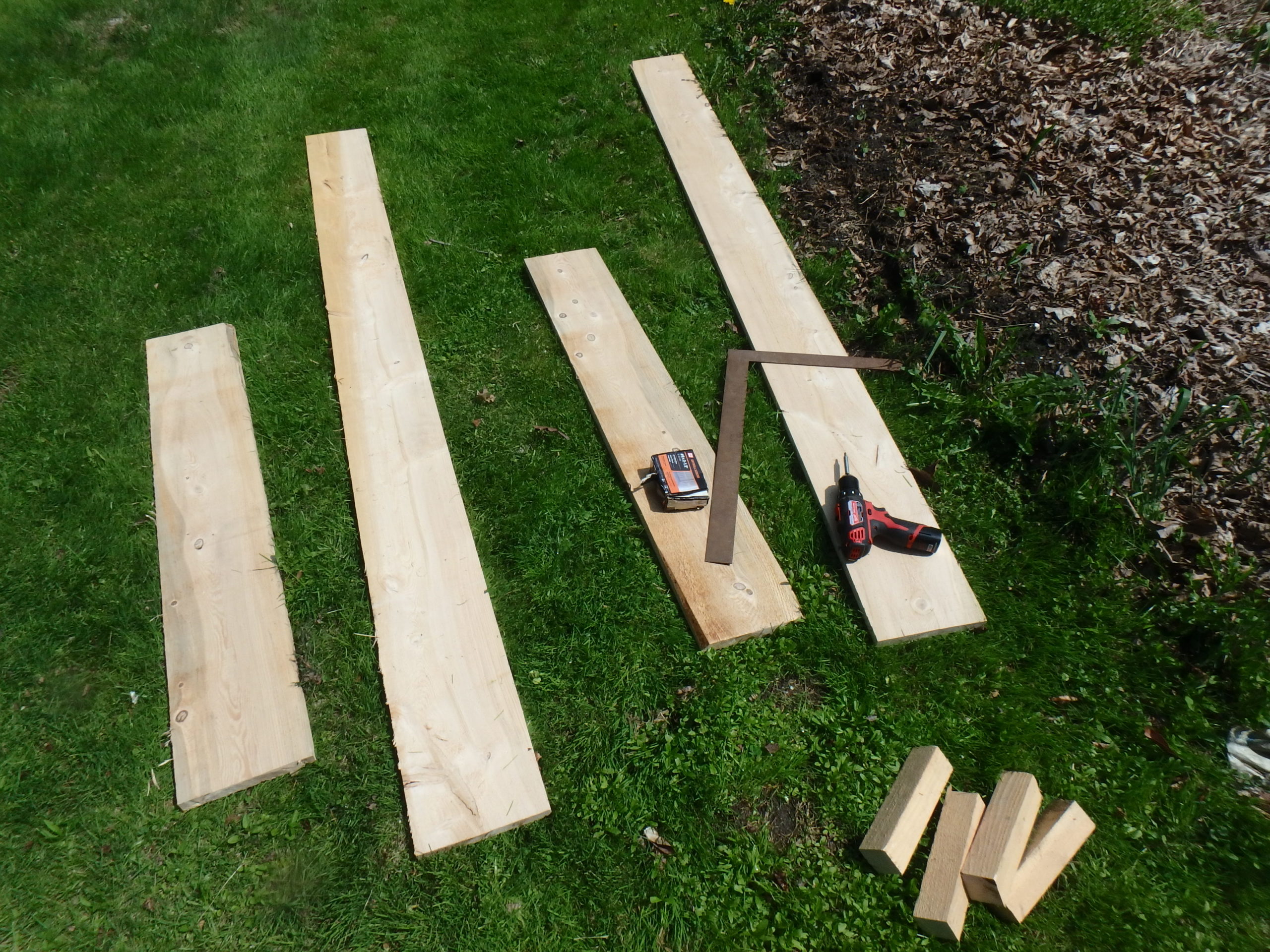 If you don’t feel handy or don’t have a saw, you can buy brackets that will hold either a 2-inch or 1-inch thick planks. Gardener’s Supply Company sells a variety of brackets designed for 2-inch thick lumber, and Lee Valley Tools has just one type and it is for 1-inch thick lumber (from a lumber yard, so they won’t work on the thicker rough sawn lumber I used). Both companies make nice products, and will ship to your door. Your local lumber yard will cut the boards you need to the length you want. Just ask.