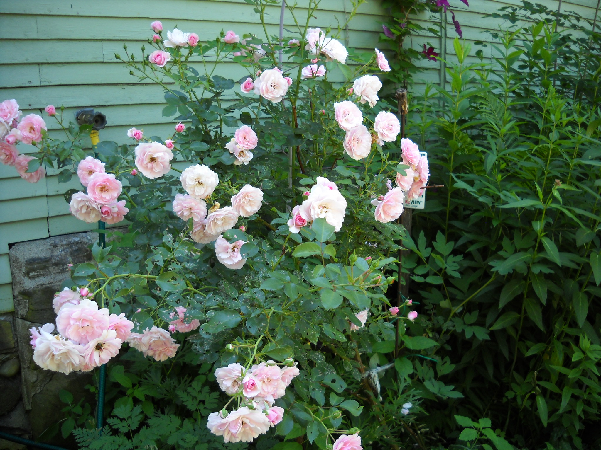 I have a rose right near my front door – and the hose that is connected there. It has bloomed well for decades, in part, because every time I fill a bucket, wash the car or use the hose, I give the rose a nice drink. Roses love water. I have a watering wand on the hose so that I can direct water to its base, and not wet the leaves. In dry summers watering roses is key. How much? At least 5 gallons per week for a mature rose.