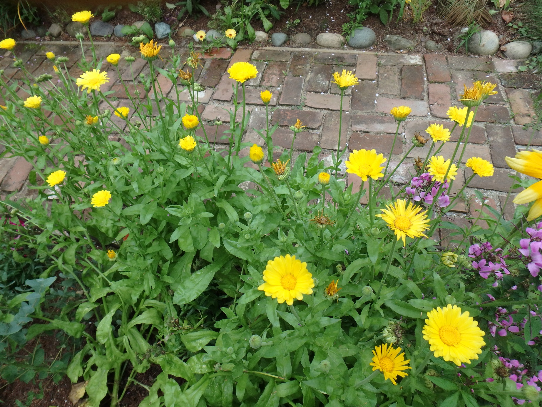 Right now my front walkway is dominated by annual flowers, many of them that I did not plant – not this year, anyhow. First and foremost are the calendula. These are wonderful bright yellow flowers in the composite family, like daisies or sunflowers. They blossom and then drop seeds on the soil so they come back every year.