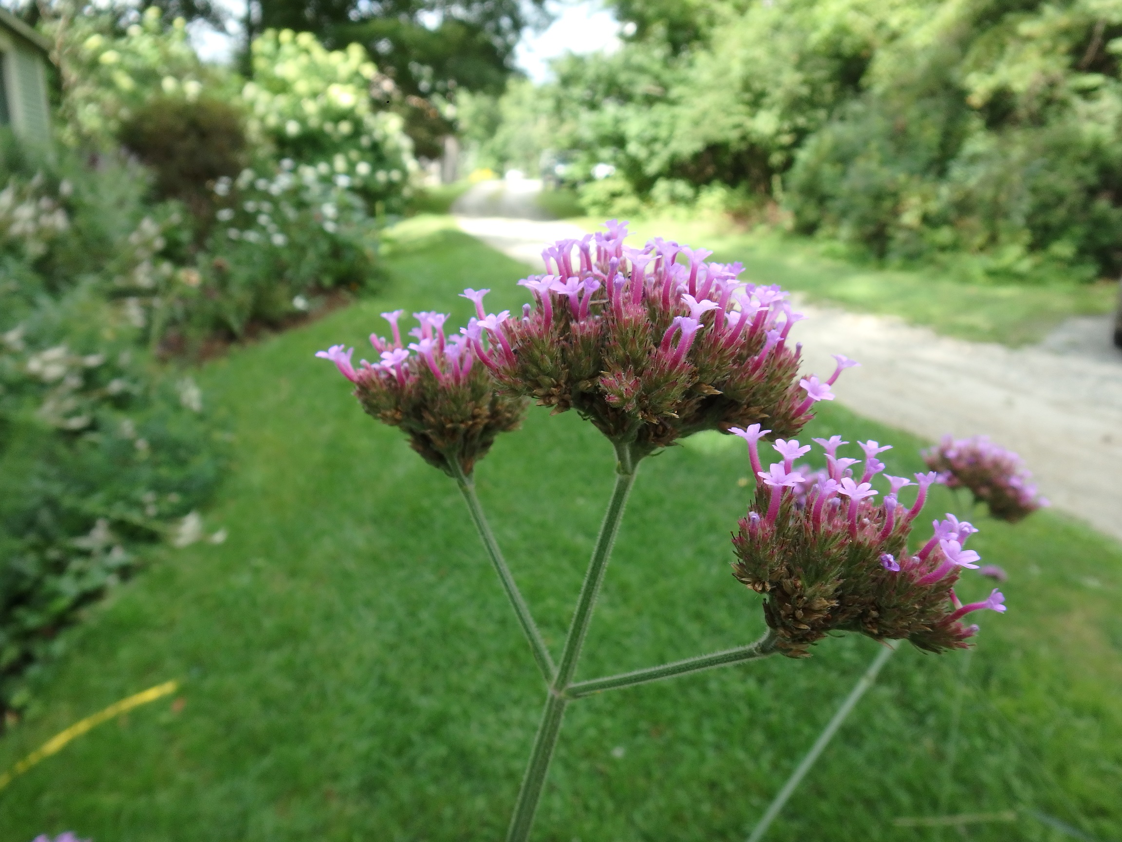 Also on my front walkway is a tall plant with tough, thin, wiry stalks that often reach 4 to 5 feet, Brazilian verbena (Verbena bonariensis). In our climate this is an annual, but back home in South America it is a perennial. It has reddish-blue flowers, usually in groups of 3 at the tops of the stems. It rarely needs to be staked.