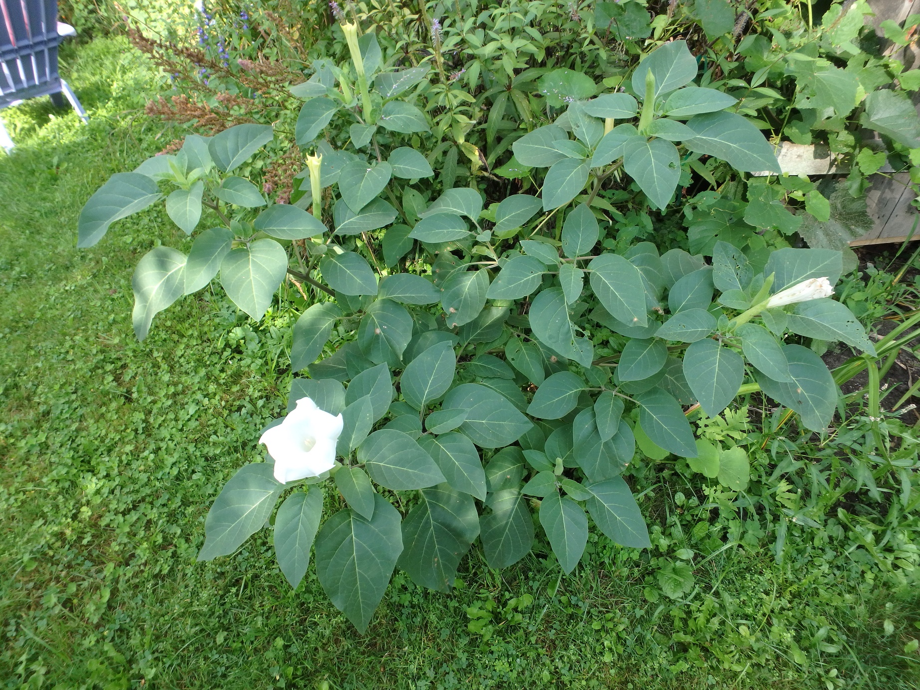 Angel’s trumpet is my substitute for Asiatic and Oriental lilies which I can no longer grow- they are consumed and ruined by an invasive red beetle. Unlike the true lilies, Angel’s trumpet is not bothered by the beetles and blooms all summer. I have read that the seeds and flowers are poisonous – they produce severe hallucinations. But the seeds come in spiny covering, so few kids or animals are likely to want to put them in their mouths.
