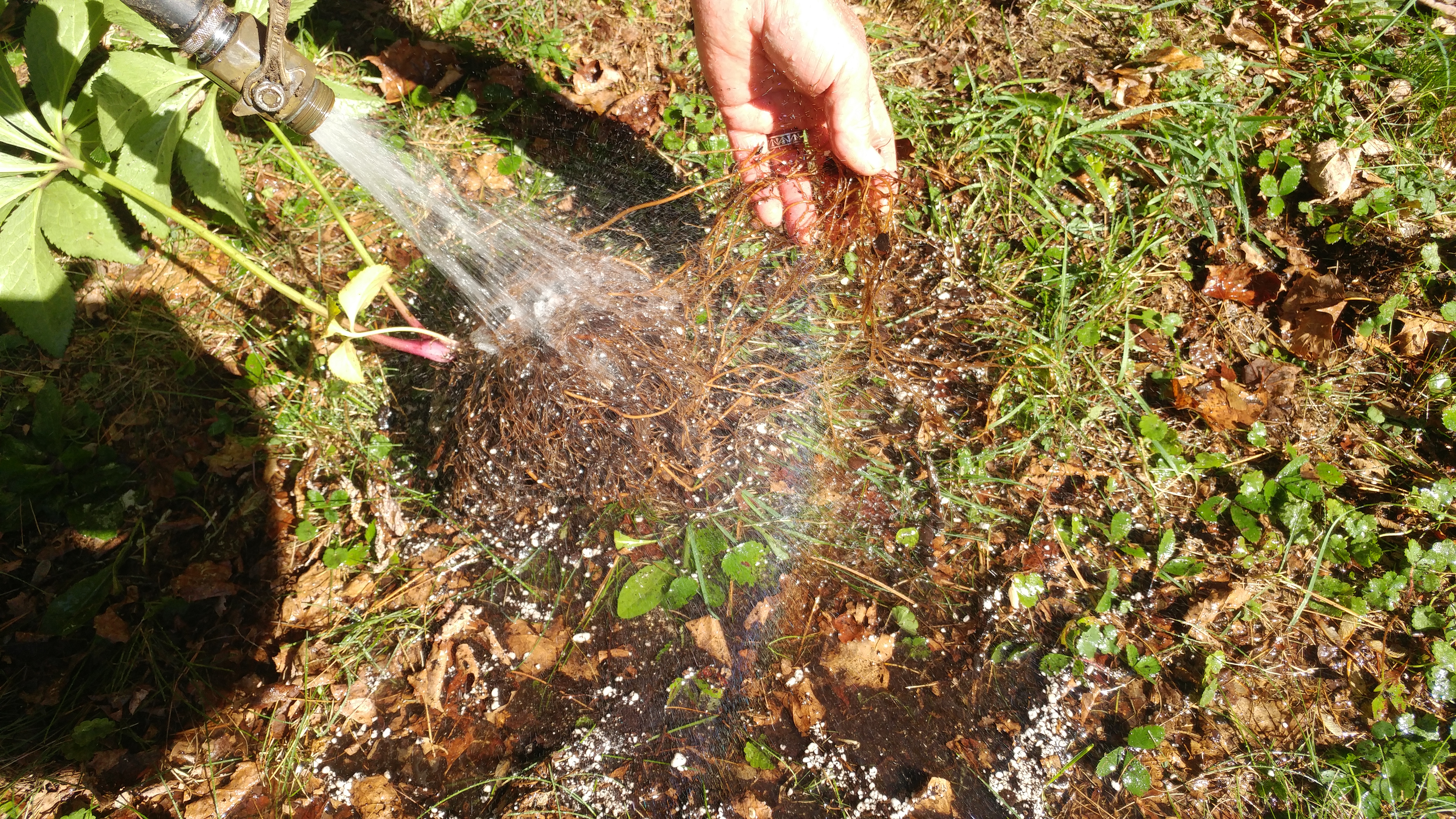 I recently went to a gardening workshop where one of the presenters advocated removing much of the soil from perennials purchased in pots before planting. The idea is that plants grown in pots get their roots all snarled up over time, and have roots circling the plants. I have always teased out plant roots with a finger or a tool, but have never used her suggestion – a stream of water.