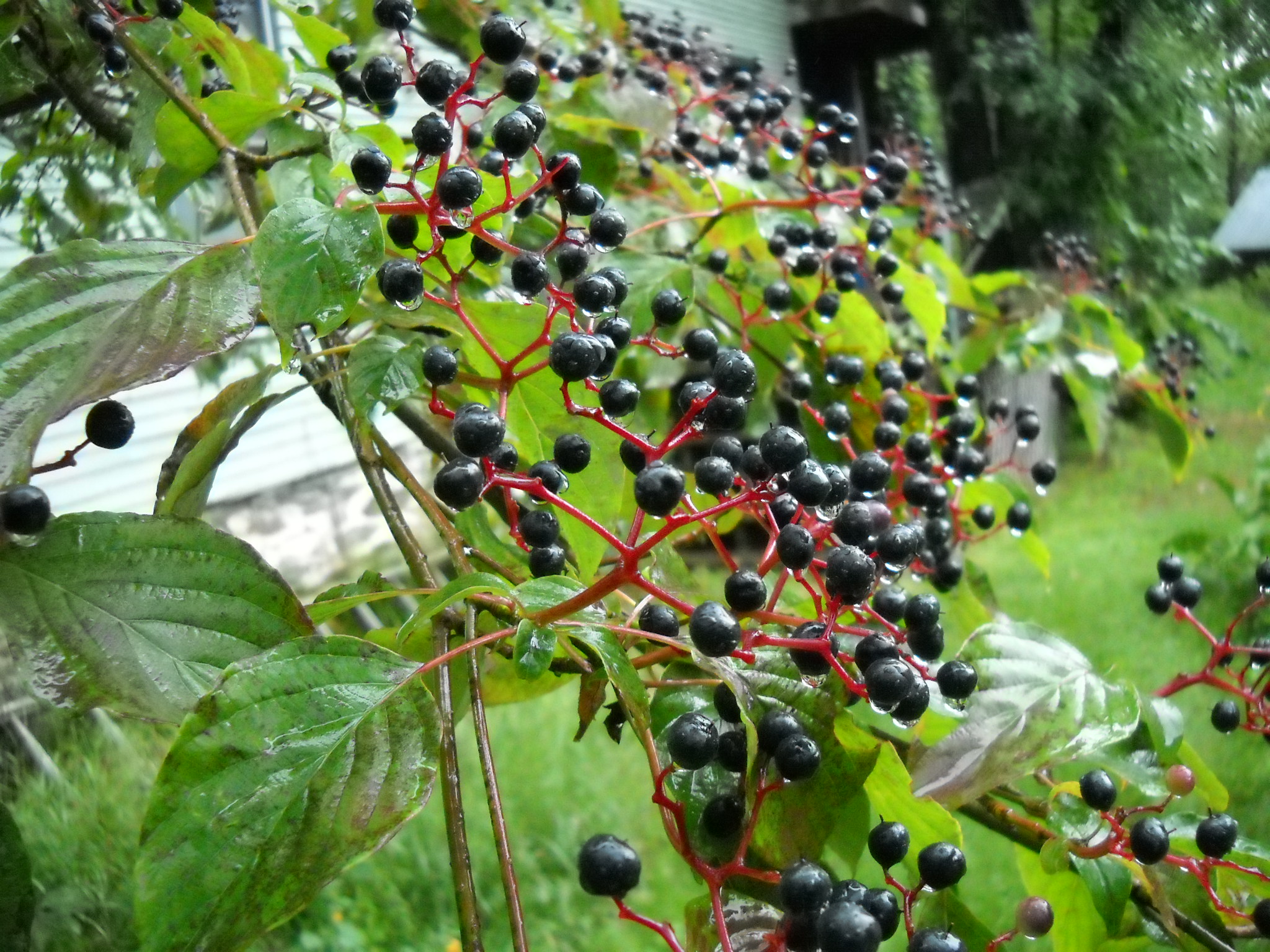 Three shrubs that produce fall berries are silky dogwood (Cornus amomum), red osier dogwood (Cornus sericea) and gray dogwood (Cornus racemosa). The first two grow wild in wet areas in part shade to full sun. Gray dogwood appears at the edges of dry forests. All produce berries enjoyed by birds. I went out in early October and found just a few berries left on silky dogwood growing wild near my stream. All have berries from August to October.