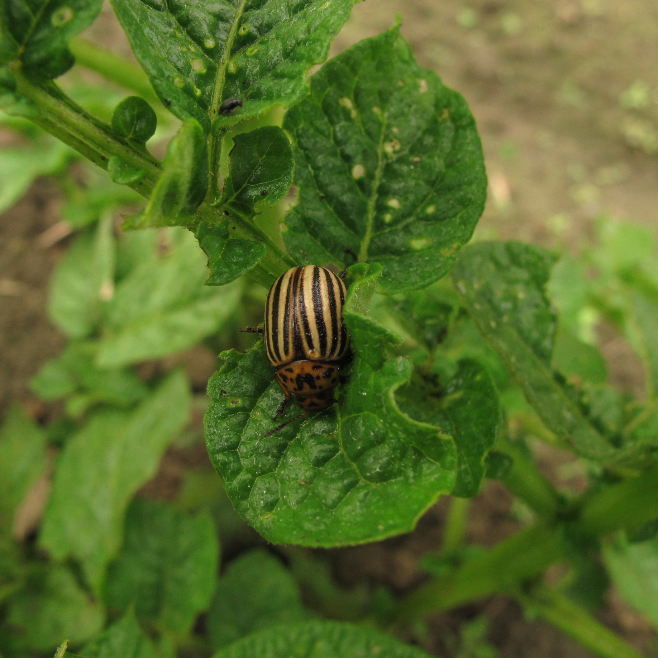 If you planted potatoes, now is the time to look for potato beetles, or their eggs on the underneath side of the leaves. The egg masses are bright orange and easy to spot. Scrape off the eggs into a jar of soapy water. If you see the beetles or their larvae eating the leaves, get them into the water, too. By reducing their population now you will reduce their exponential increase in numbers. If you see holes in the leaves, you have the beetles.