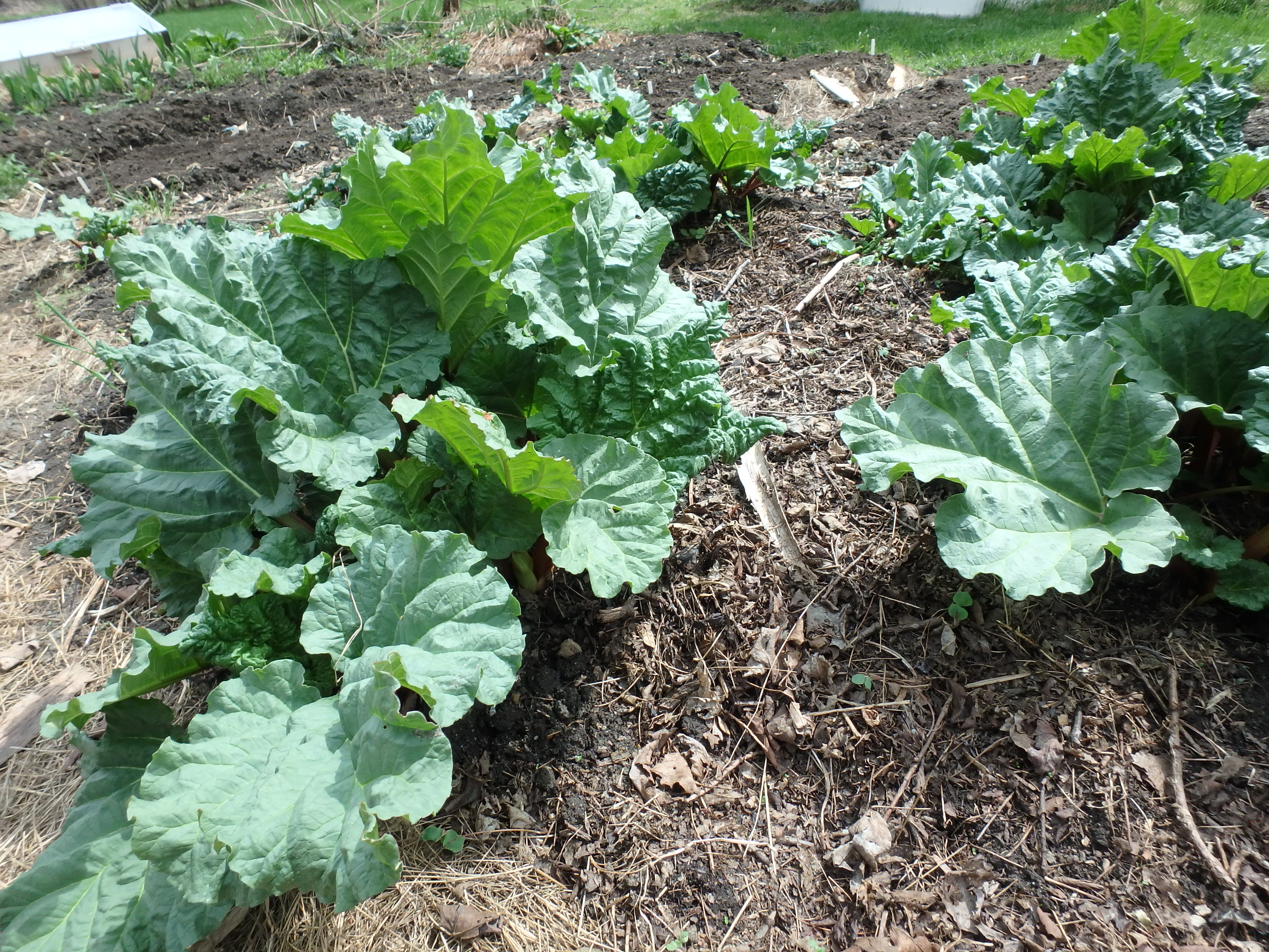 What else is coming up in the garden? Rhubarb. This sharp-flavored perennial stalk is a favorite of mine. Some varieties have deep red stems, others are green with just a hint of red. All will make you pucker up if you take a bite raw. The leaves contain oxalic acid, and are said to be poisonous.