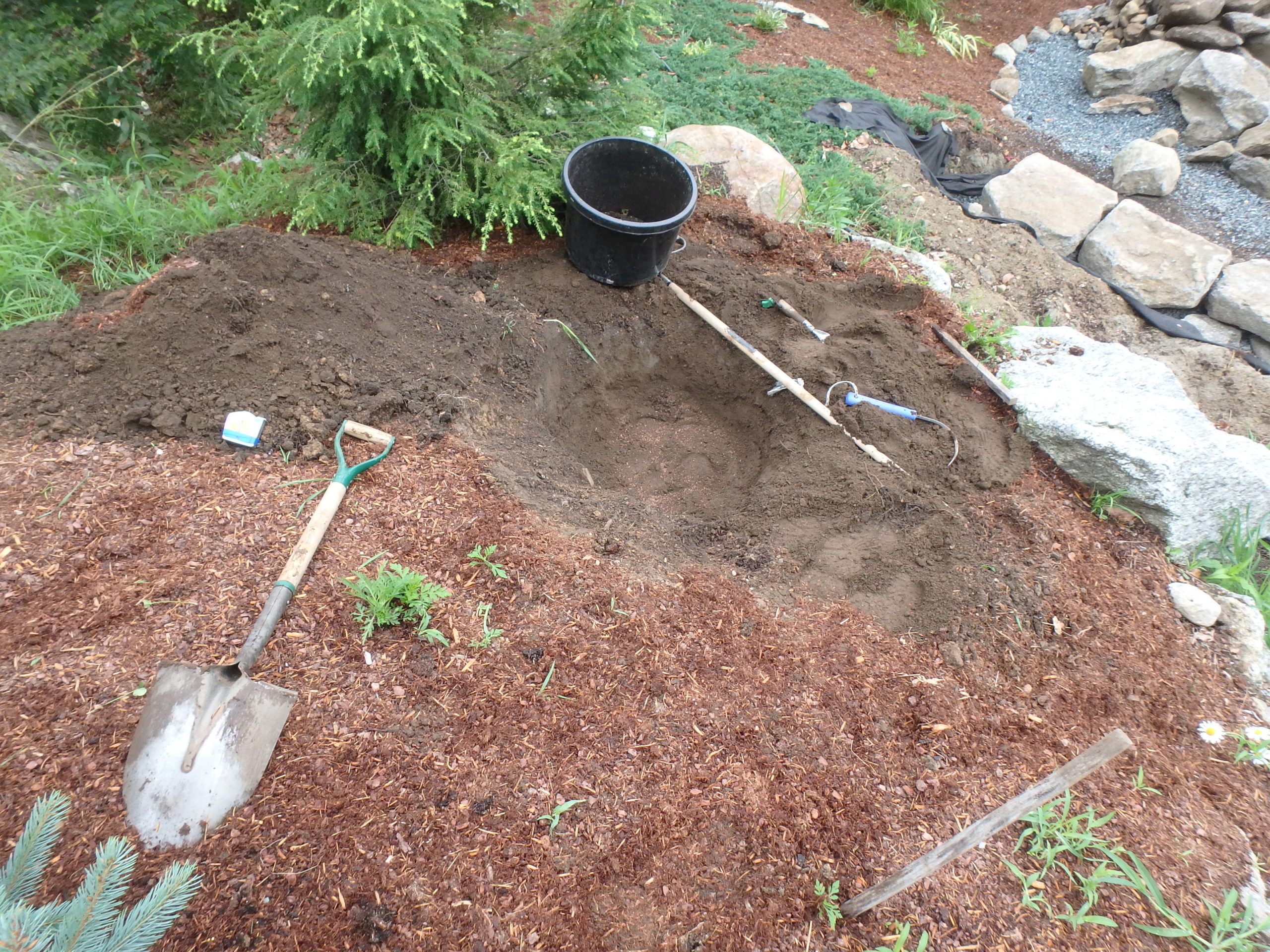 I recently planted a couple of blue spruce trees on a nice cloudy day, and want to share with you what I did. First, and most important, I checked the position of the trunk of the tree in the pot. In the wild you will notice that trees bulge out at the base, creating what is termed the “trunk flare”. This must be visible above ground after planting.