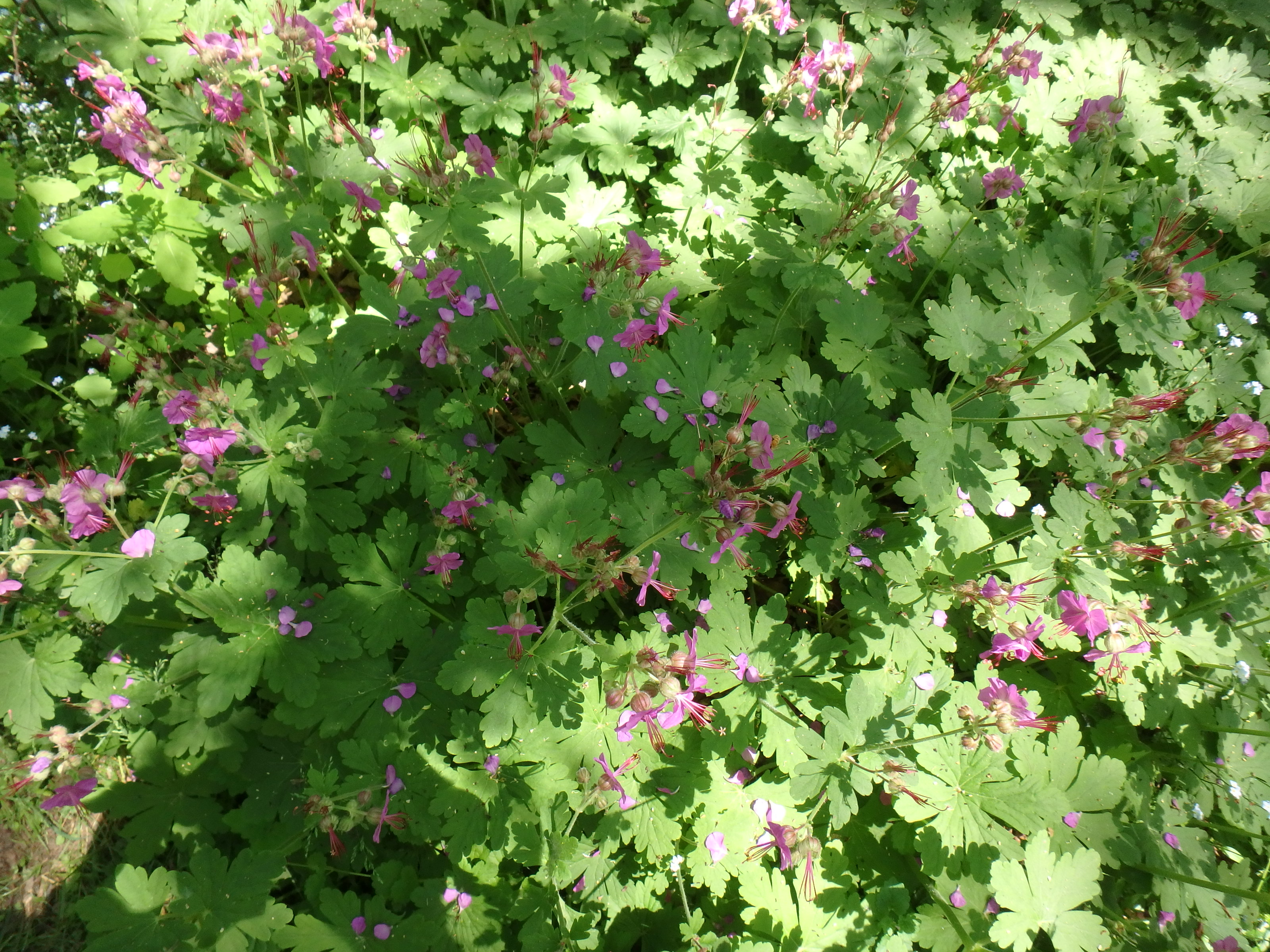 The bigroot geranium thrives where other perennials may survive, but few love: dry shade with competition from tree roots. Maples and locust are notorious for sucking everything out of the soil, yet I have planted the bigroot geranium under those trees, and had them thrive. Will they grow under hemlocks or pines? No, that’s asking too much.