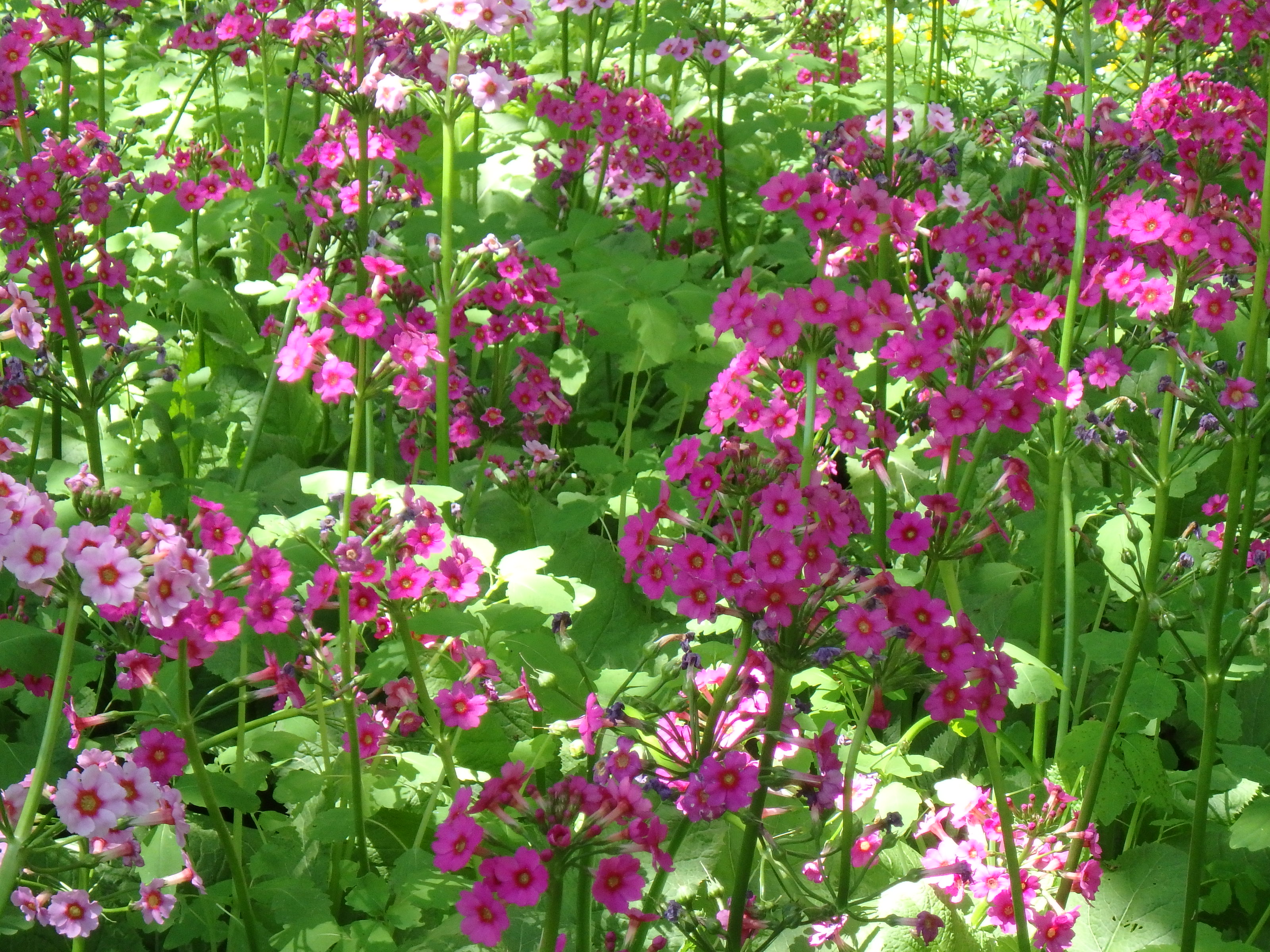 I estimate that right now I have 200 to 250 square feet of primroses in full bloom; in a 3 foot by 3 foot square, I counted about 25 or 30 plants in bloom – so I have more than 500, perhaps even 750. All this in 10 or 15 years, and no work other than a once-a-year weeding of Jewel Weed, which also loves the conditions.