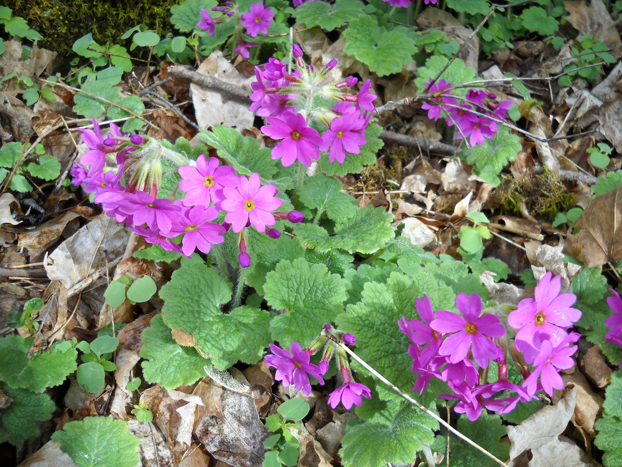 Primroses bloom early, and come in a wide range of species and colors. I have at least 6 different species in bloom now. One of my favorites has no common name, only going by its scientific name, Primula kisoana. Because its species name starts with “kis”, you can call it the kissing primrose – even if no one else does (except me). It has bright magenta-colored flowers that stand just a few inches above the light-green leaves. It is not very well known at nurseries; I found mine at Cider Hill Gardens in Windsor, VT (www.ciderhillgardens.com).