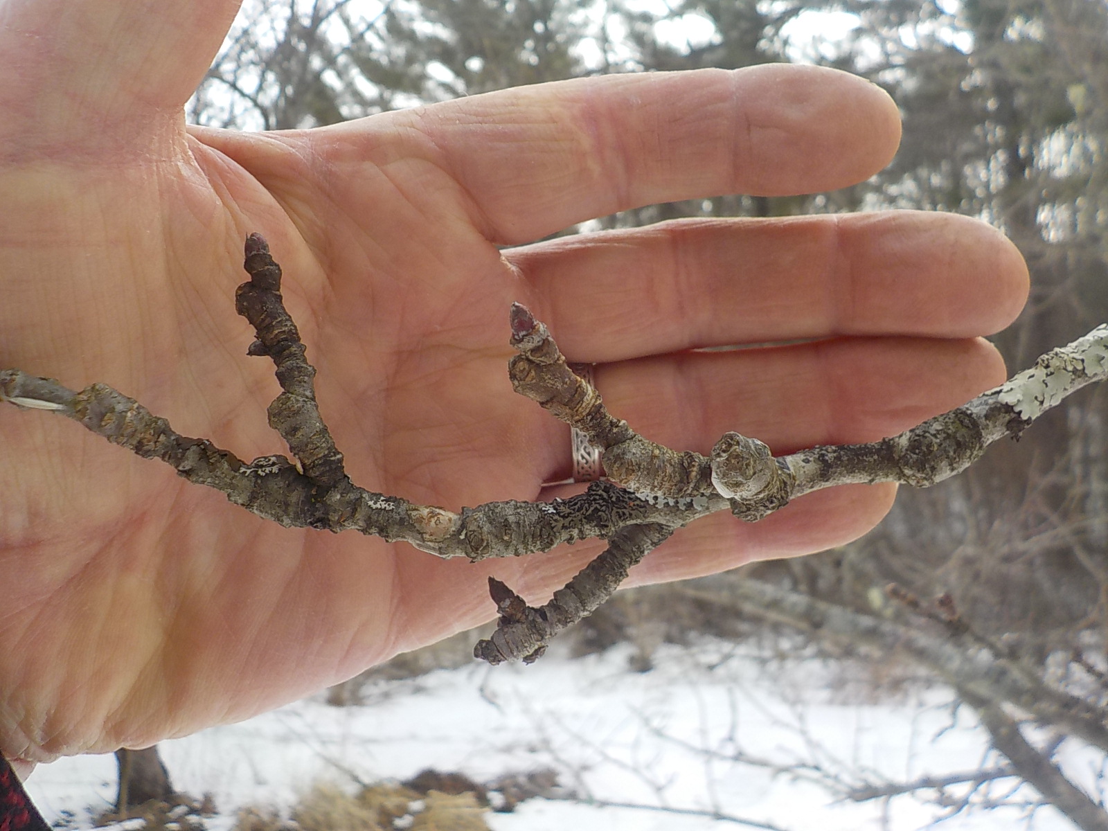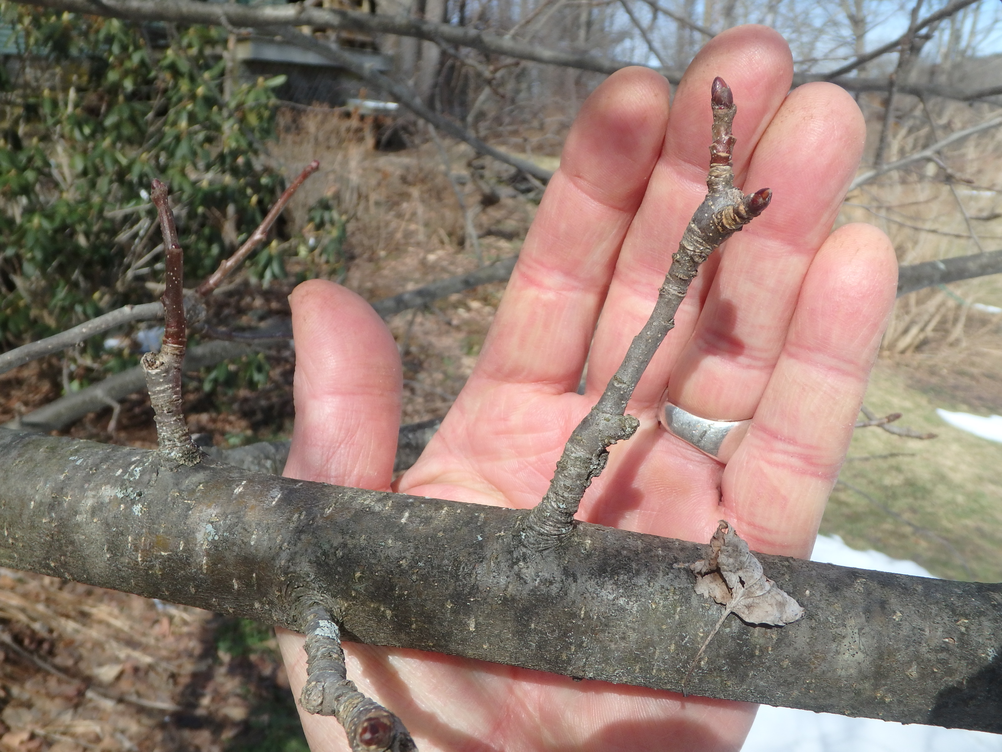 Blossoms and fruit appear on little fruit spurs, generally 3-4 inch twigs with a few larger buds. Fruit grows on spurs that are at least 3 years old. Each bud will produce more than one blossom and a few leaves. If you take a few branches with fruit spurs and place them in a vase, they will eventually bloom inside the house – a real treat for me. Other buds will just produce leaves, but even those are nice at this time of year.