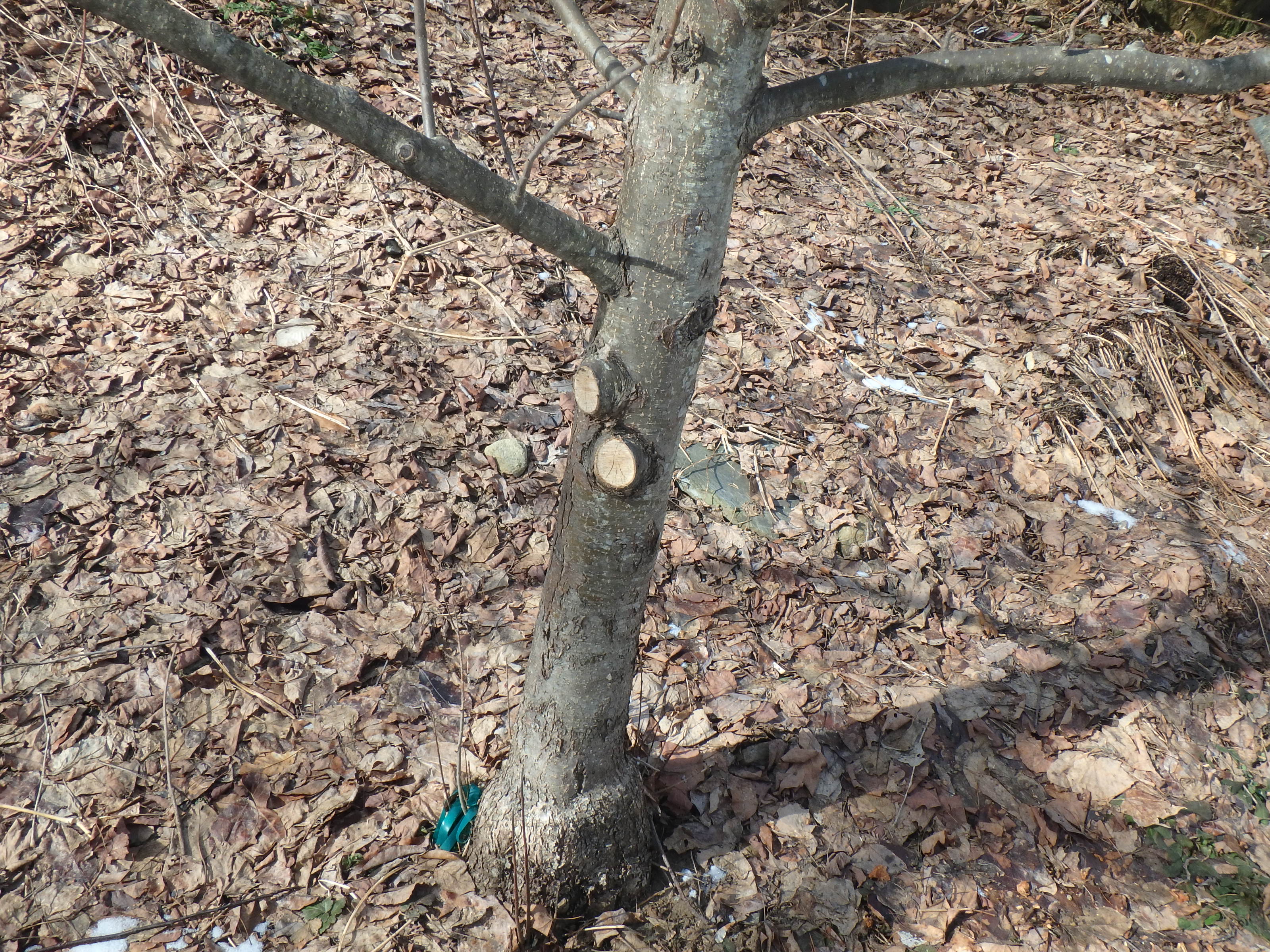 I do insist on a clear trunk up at least 3 or 4 feet from the ground, or even more. This allows me to get to the trunk of the tree to pick fruit, to prune or to mow beneath it. Ideally, low branches are cut off when a tree is small. But if not, start there this year.