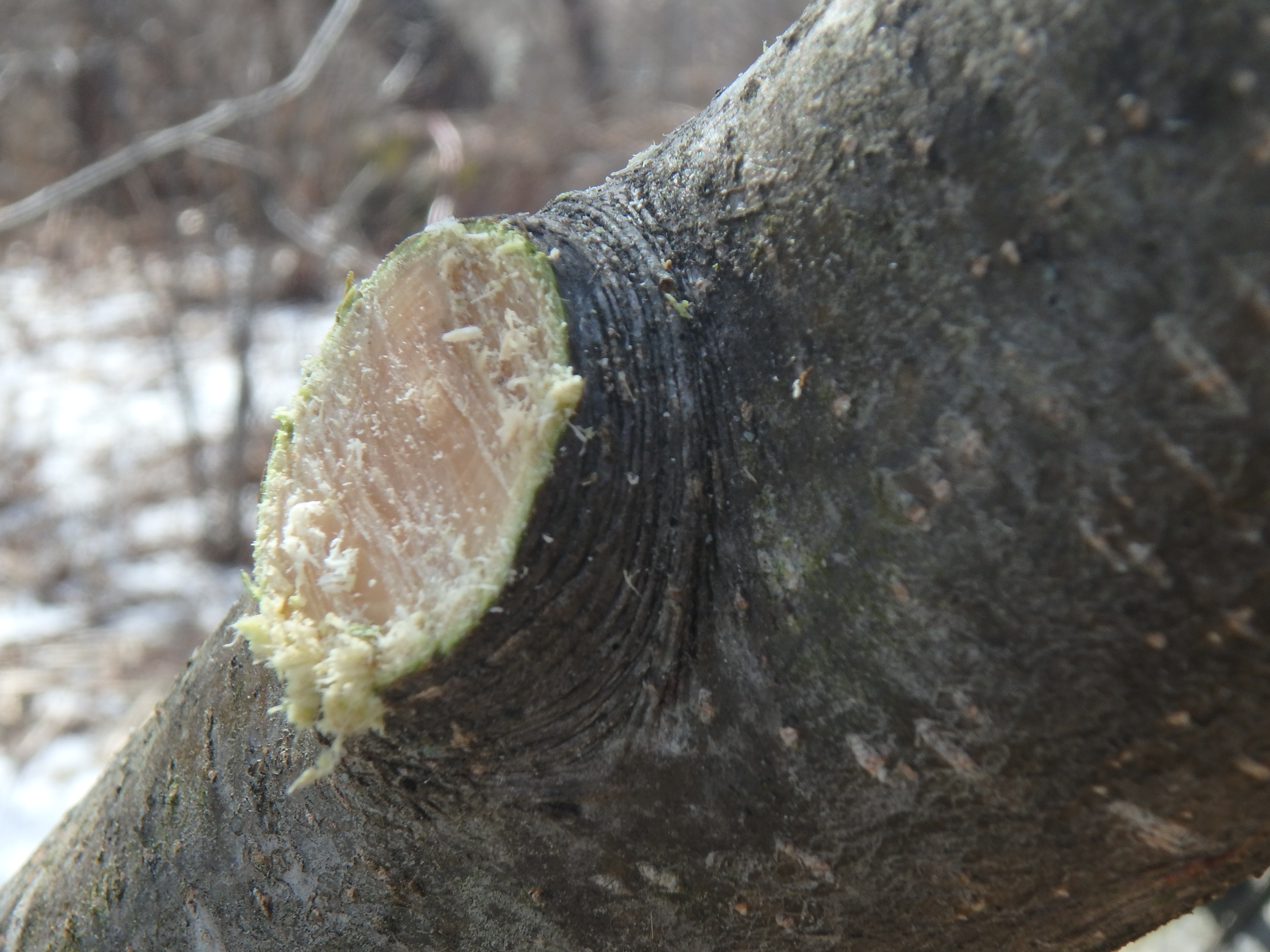 Next, if 2 branches are rubbing or in danger of fusing together (because they are growing so close together), I remove one of them. On this tree, a four-inch diameter branch was rubbing against and fusing with another, so I removed it in a 2-part procedure. First I reduced the weight of the branch by lopping off most of it. This made the finish cut easier. A heavy branch is likely to snap off and tear the bark before the cut is completed.
