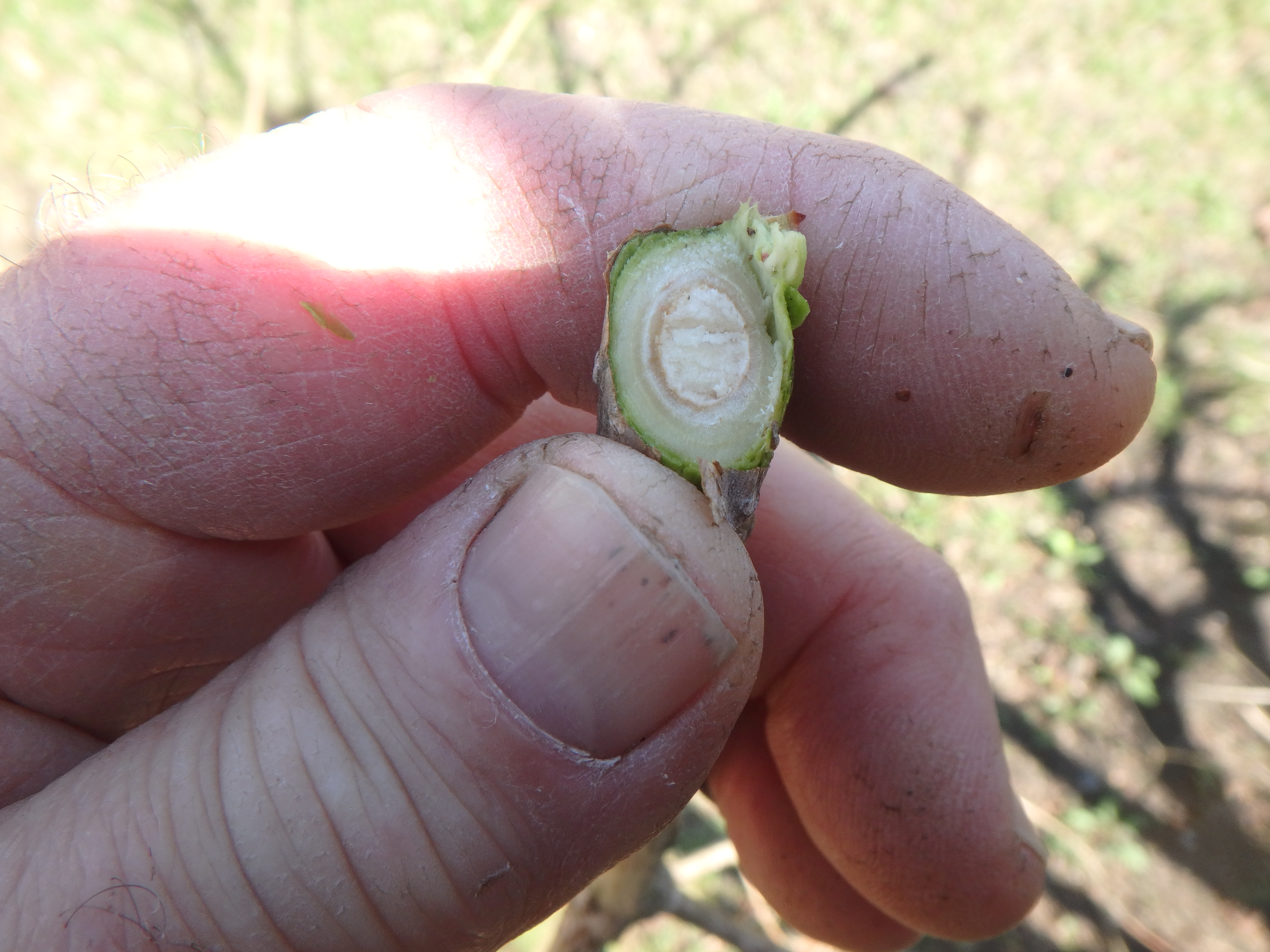 How should you make your cut? On an angle, just a little above a bud. Look at the piece you cut off. If it is brown all the way through, you are looking at dead wood. You should cut lower down the stem until you see a layer of green just beneath the bark.