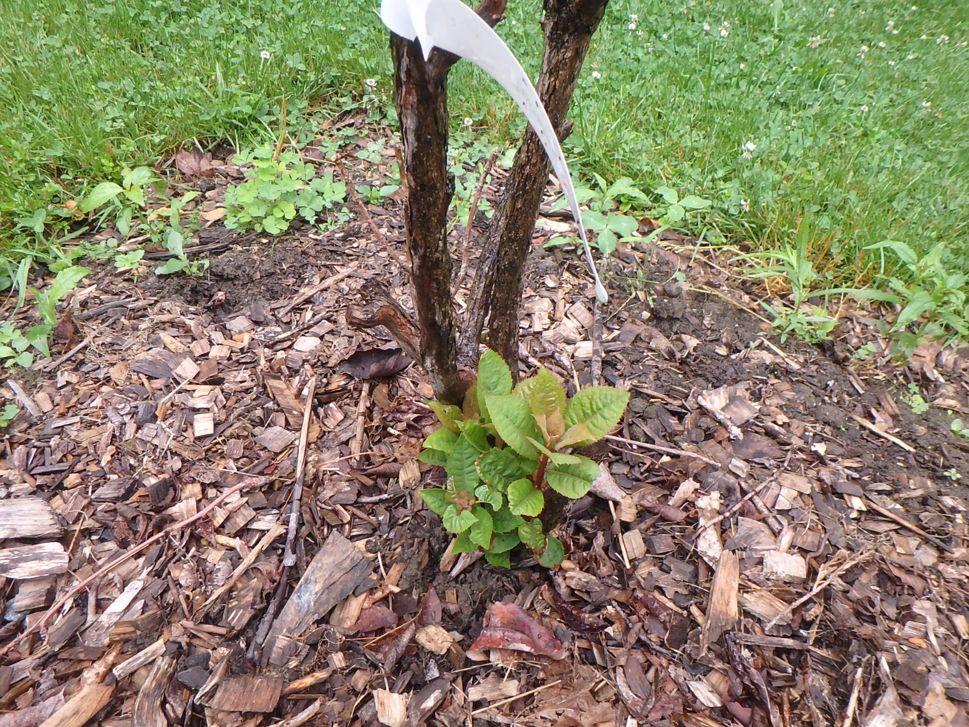As I was lopping off the branches prior to digging it out, I noticed a few leaves growing at the very base of the tree. Life! So I am letting it stay. Unfortunately, I do not know if the tree was grafted onto a different rootstock, which is common in the landscape trade.