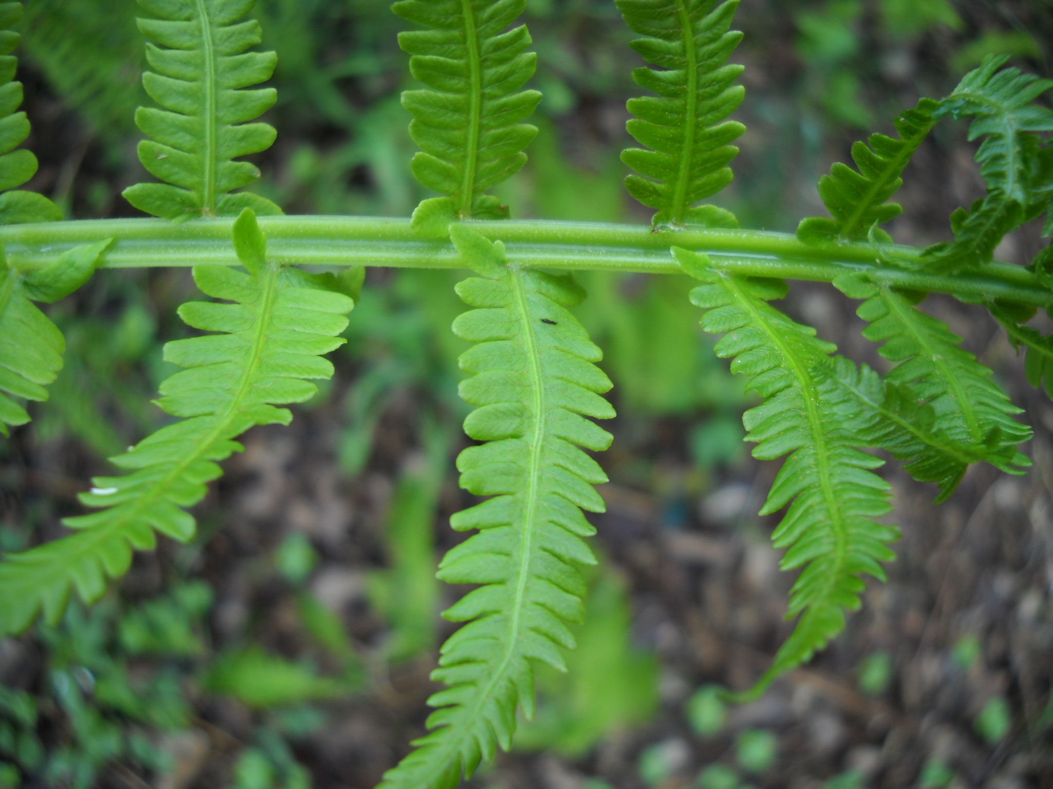 Sensitive Fern (Onoclea sensibilis): This fern has light green leaves that are quite wide. Leaflet pairs are opposite each other (like a bow tie). Top-most leaflets are smooth, others have wavy edges. It is very frost-sensitive, hence the name. It often grows in big colonies, either in sun or shade. Can be a pest in the garden as it spreads by root. It is the only fern that I always pull out if it shows up in my garden as it spreads fast and is fairly coarse in looks.