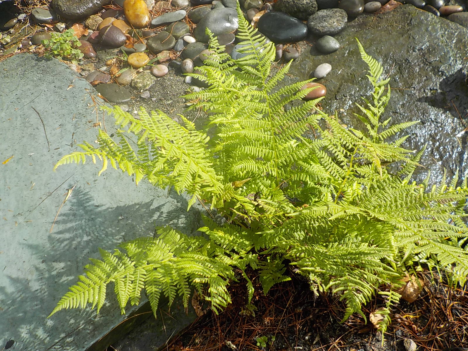 This hay-scented fern planted itself right by my front door, surrounded by stones in hot afternoon sun.
