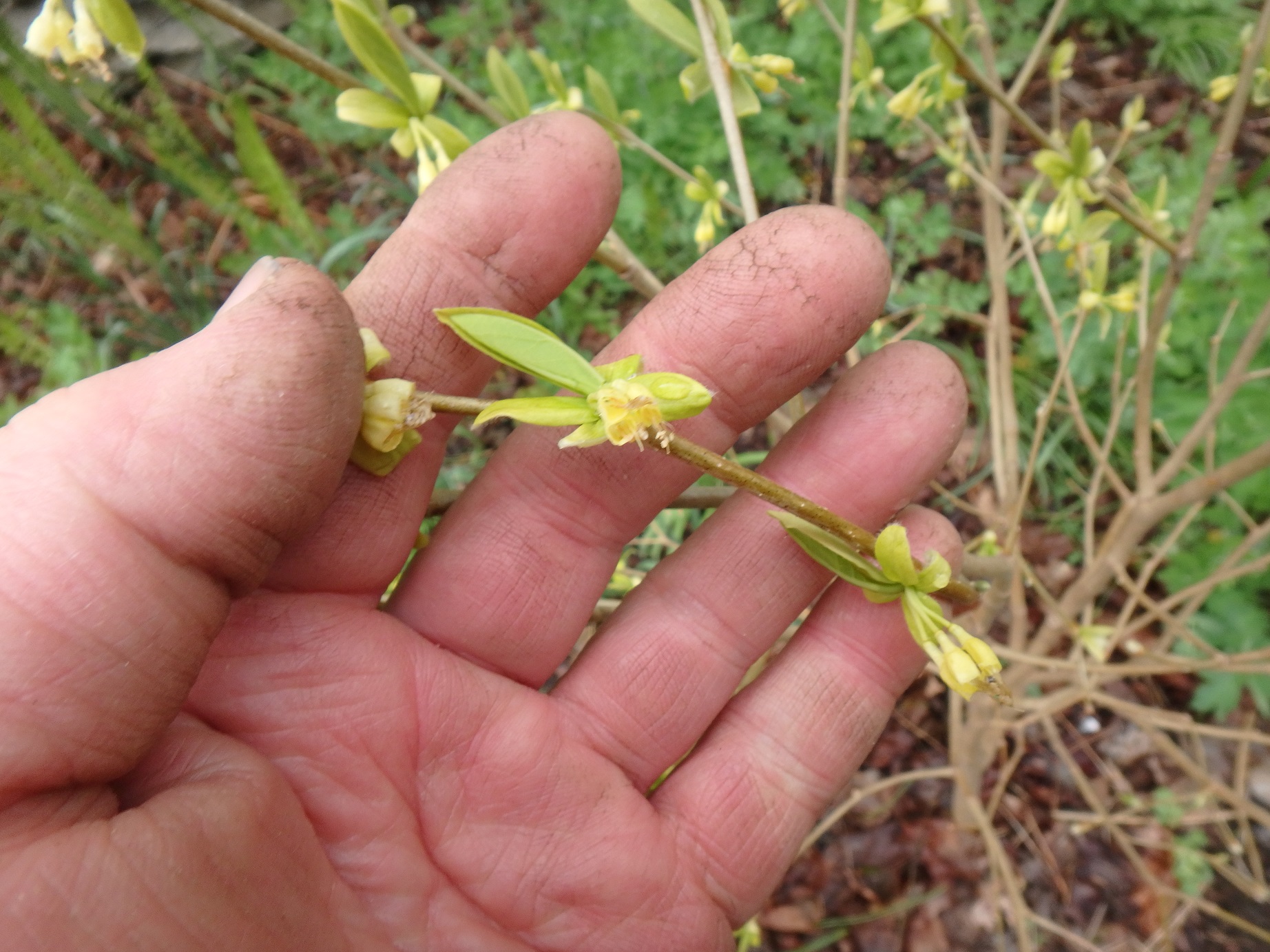 In contrast to the flamboyant forsythia is a nice native, leatherwood (Dirca palustris). This understated plant blooms just as it leafs out in March, April or early May, depending on where you are. It does best in full shade. Although Dirr’s book says it prefers a moist, dark soil, I have it in a dry location and it does just fine. The blossoms are pale to bright yellow, small, but plentiful. The bark is a handsome gray. But it is hard to find in a plant nursery. I bought one several years ago and have looked for others, but have not found another nicely shaped specimen. Look for it. Slow growing, it requires little or no care.