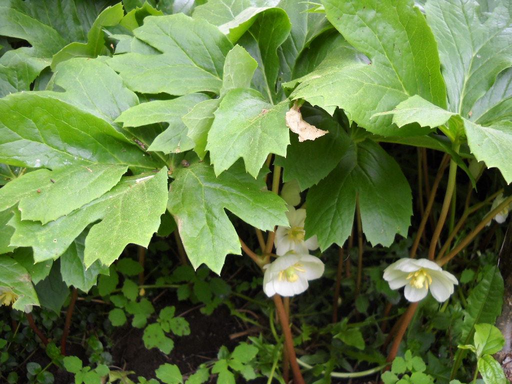 I have a large patch of Mayapple (Podophyllum peltatum). As the authors point out, it spreads robustly and shades out other plants. The blossoms appear beneath the big, wide leaves and are not easily seen; they suggest planting it on a steep incline, so that one can see them – and the fruit, bright red “apples” when standing below the planting. I have seen the fruit, but never knew it was edible until reading about it. Apparently the fruit is also eaten by box turtles. Who knew? Note: “Since writing this, I read elsewhere that that the seeds and rind may be toxic, so better to avoid eating May apples.”