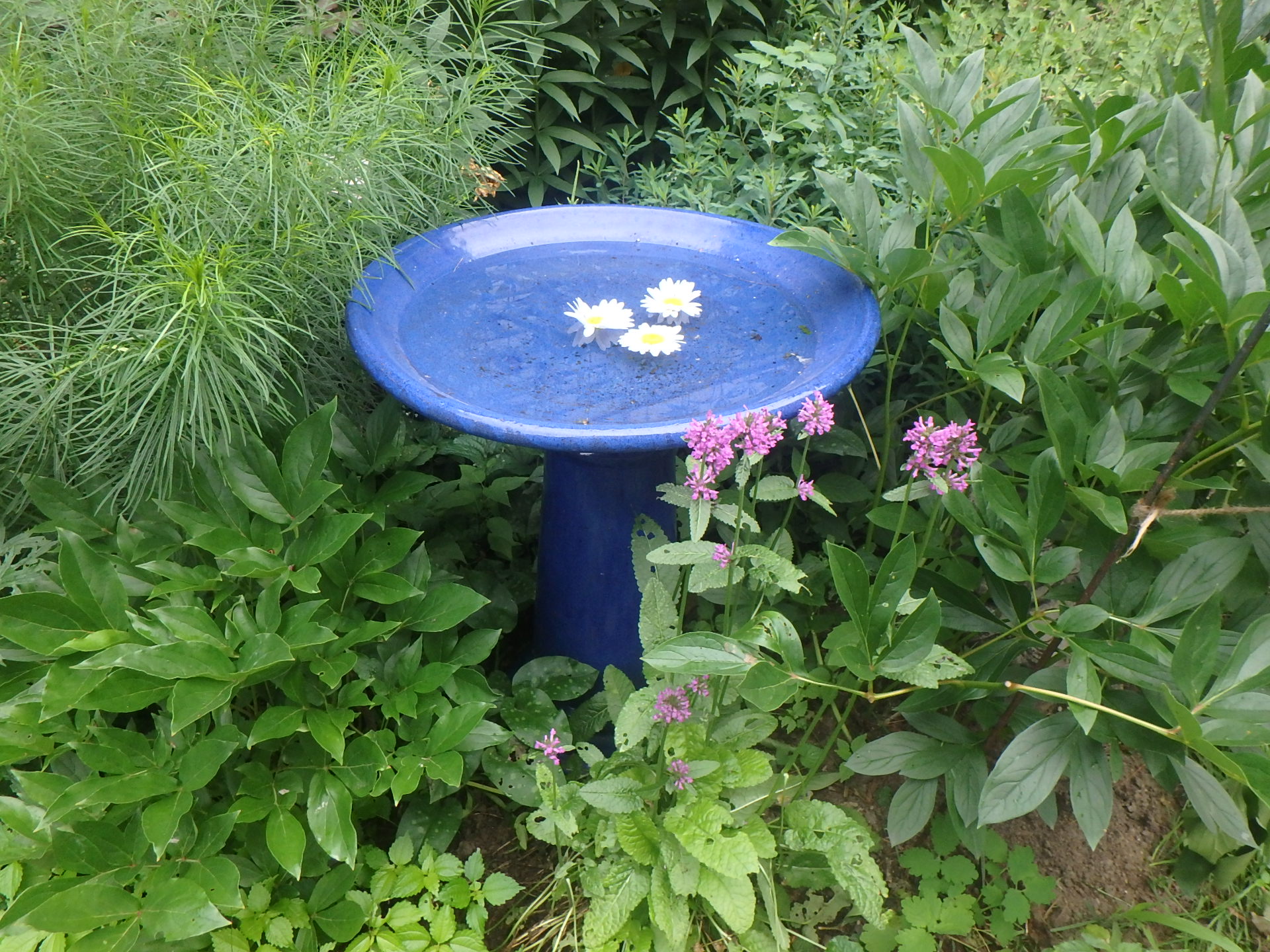 Other things are easier than stone projects. I have two nice blue ceramic bird baths. They contrast nicely with the flowers around them, even though no birds ever bathe there. But I love the water in them, and that my wife Cindy Heath floats cut flowers in them. (Yes, my longtime partner and I finally got married July 1 in a Zoom wedding attended by loved ones all over.)