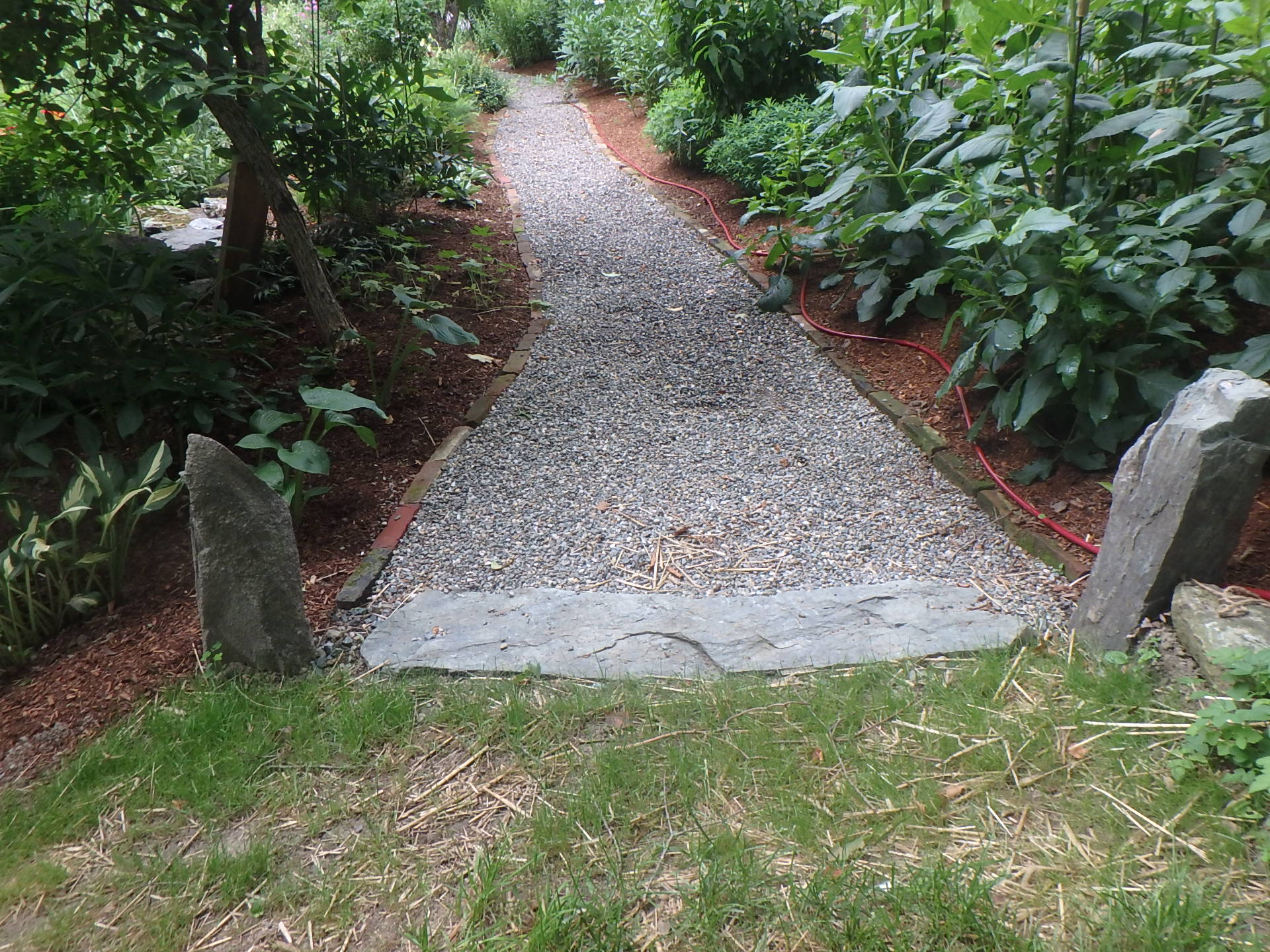 Pathways are important to gardens. They can keep your shoes out of mud and protect the soil from erosion. Flat stones are great, as are pea stone or small gravel. Chipped branches or bark mulch can be used for walkways, too. Pathways naturally lead one forward to other parts of the garden. Grassy paths are simple, and work well so long as they are not worn bare by too much foot traffic.