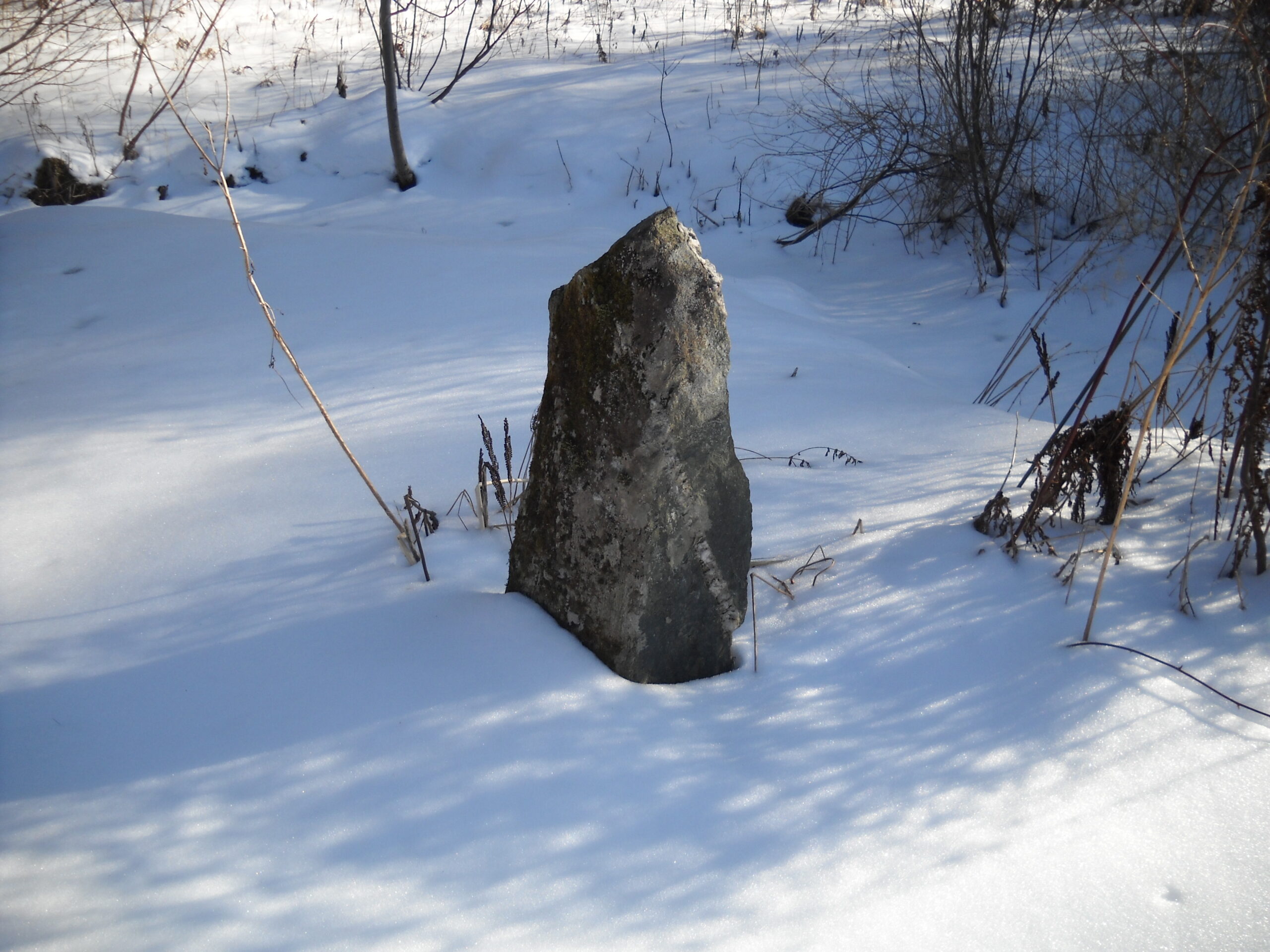 Over the years I have installed a few standing stones. They contrast nicely with flowers in the summer, and better yet, they stand out in winter. I have chosen stones that are 3 to 4 feet long and quite narrow.