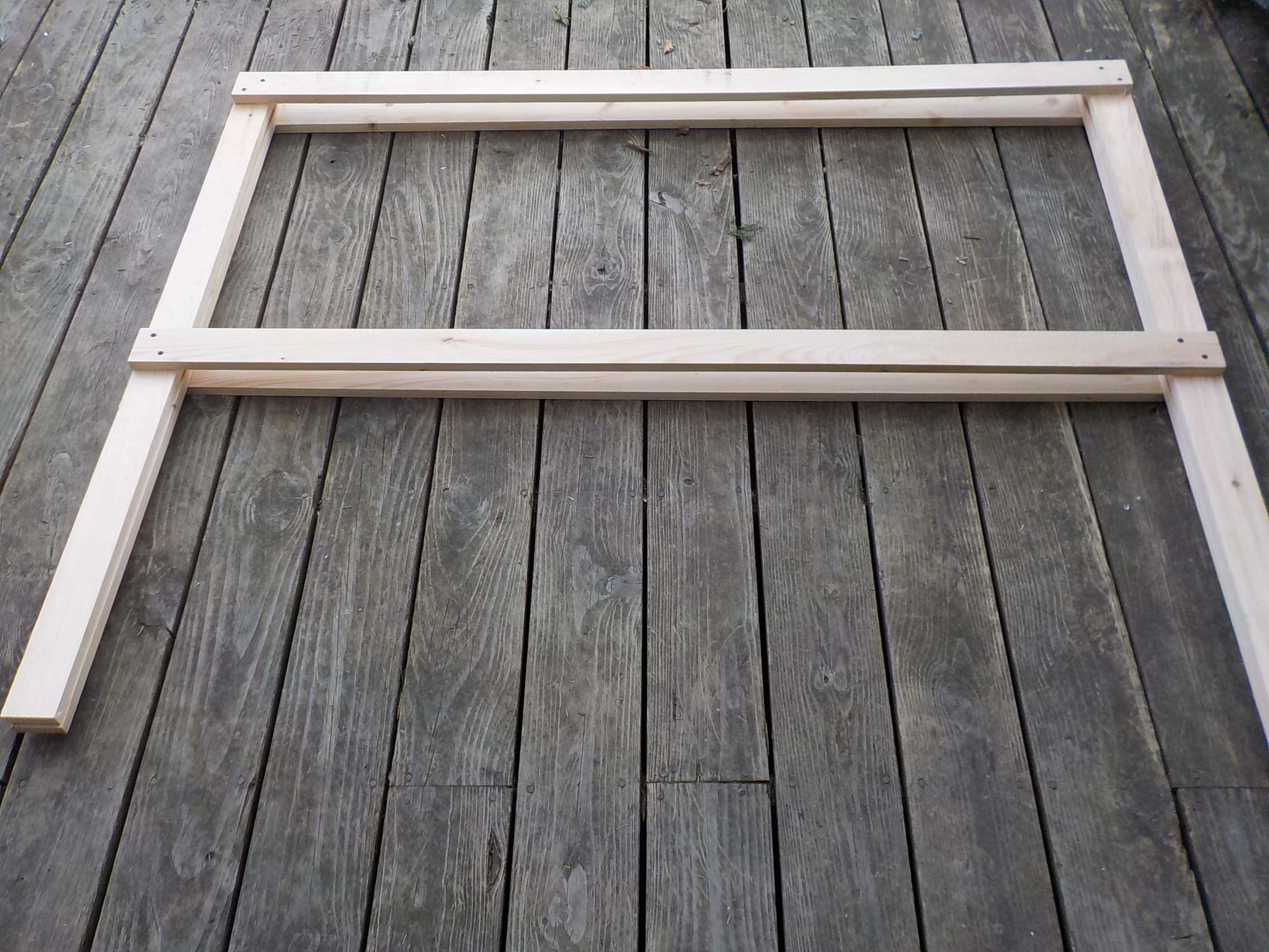 Next close up the hinged legs and place them 5-ft apart on the floor. Place 2 of the 5-ft pieces on top of the first side. One should be screwed right at the top, one 24 inches from that. Flip over the stand, and do the same on that side. Stand it up, and spread the legs 2 feet apart at the bottom. Then add a cross brace on each end of the A-frame just below support pieces for your shelves.