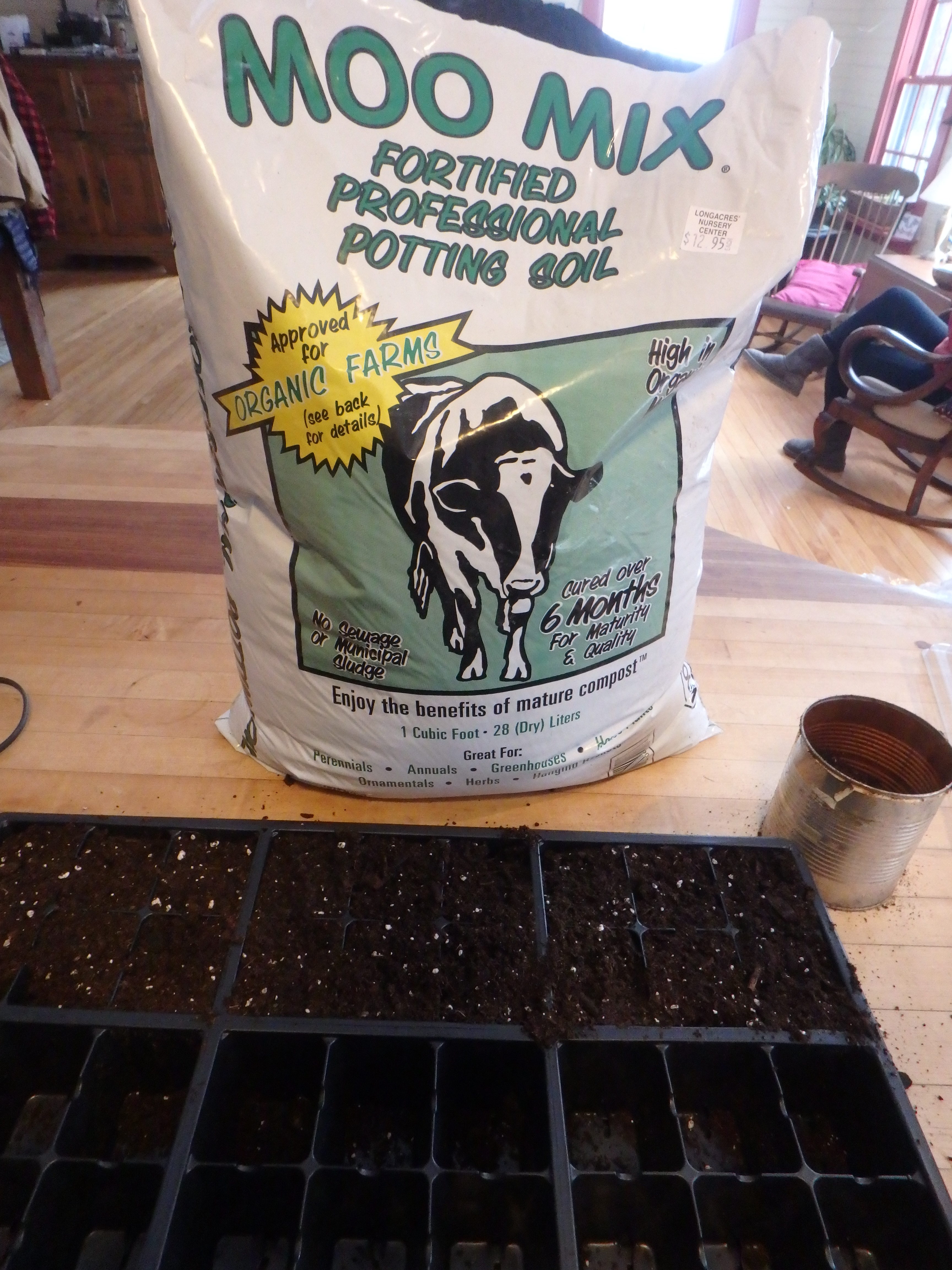 Don’t even think of starting seeds in garden soil. Although I sometimes make soil blocks from compost and peat moss with some added garden soil, usually I just buy Moo-Doo brand planting mix that I put in little plastic 6-packs. I always buy the 6-packs that have the biggest cells available. Some come with 72 compartments to the flat, some 48 and others 36 or 32. I like the 32’s – they have more room for roots.